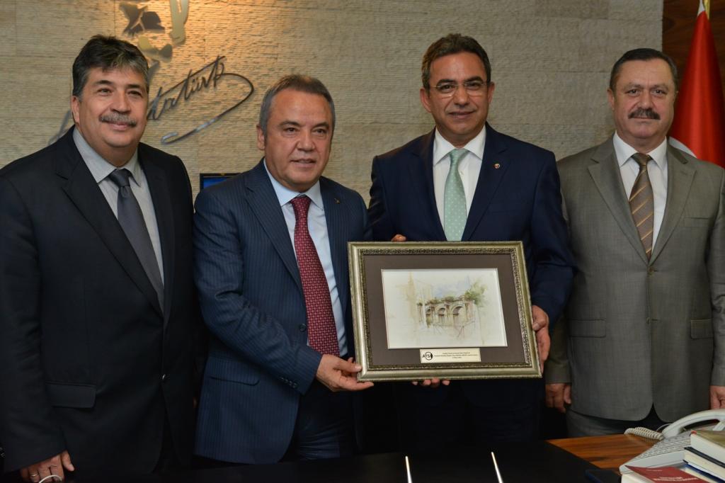 Tebrik ve başarı dileklerinde bulunan ATSO Başkanı Çetin Osman Budak, Böcek’e Antalya’nın simgelerinden olan üç kapıların resmedildiği bir tablo hediye etti. Konyaaltı Belediye Başkanı Böcek, ziyaretlerinden duyduğu memnuniyeti dile getirerek, teşekkür etti.