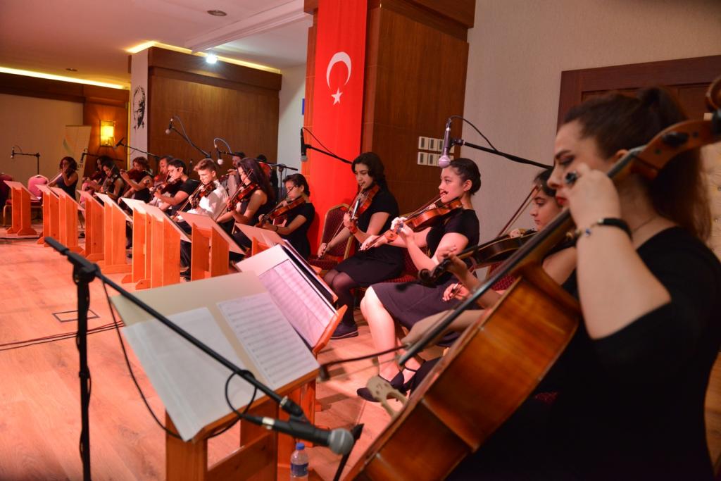 Buket Güzel’in şefliğinde Konyaaltı Belediyesi Feslikan Salonu’nda düzenlenen konsere Antalyalılar büyük ilgi gösterdi. Minik kursiyerler kemanlarıyla muhteşem bir performans ortaya koyarken, KONSEM müzik öğretmeni Burcu Söylemez’de zaman zaman seslendirdiği solo şarkılarla renk verdi.