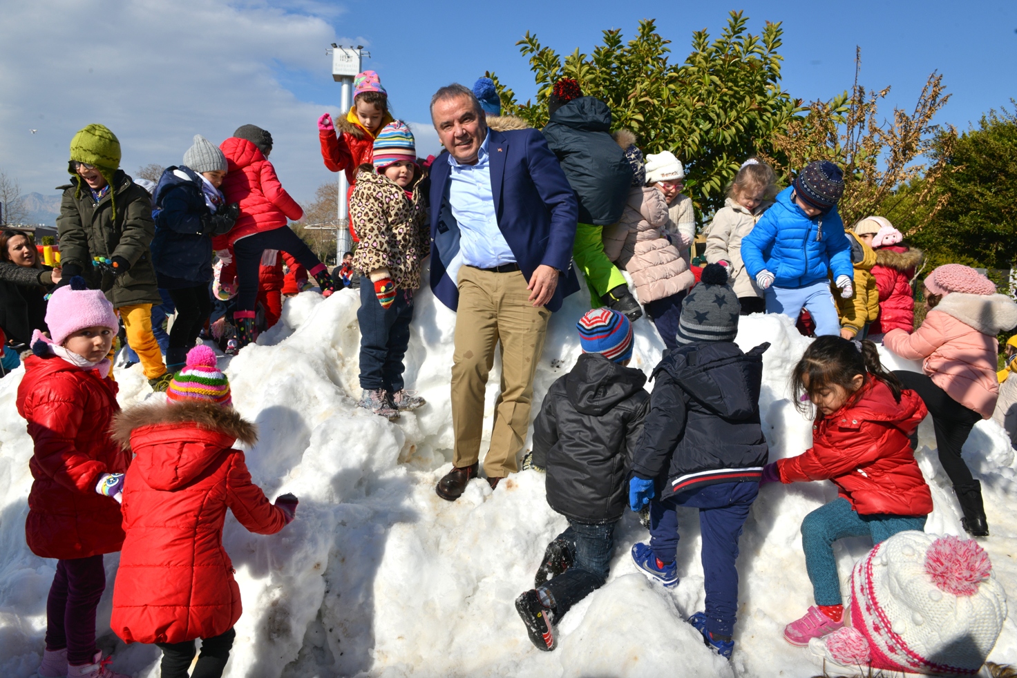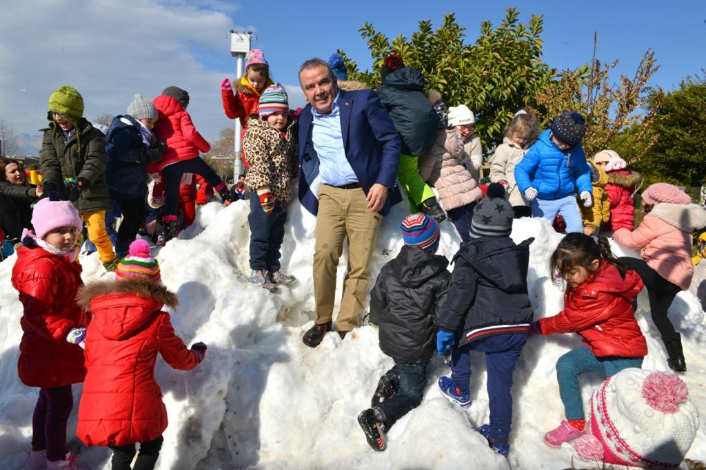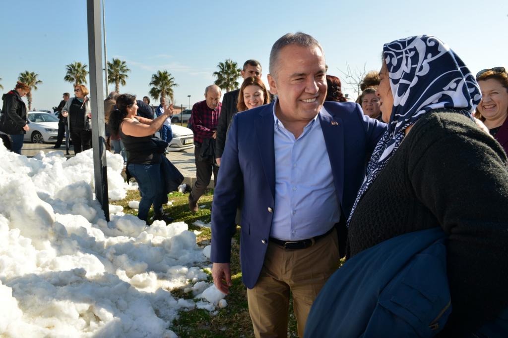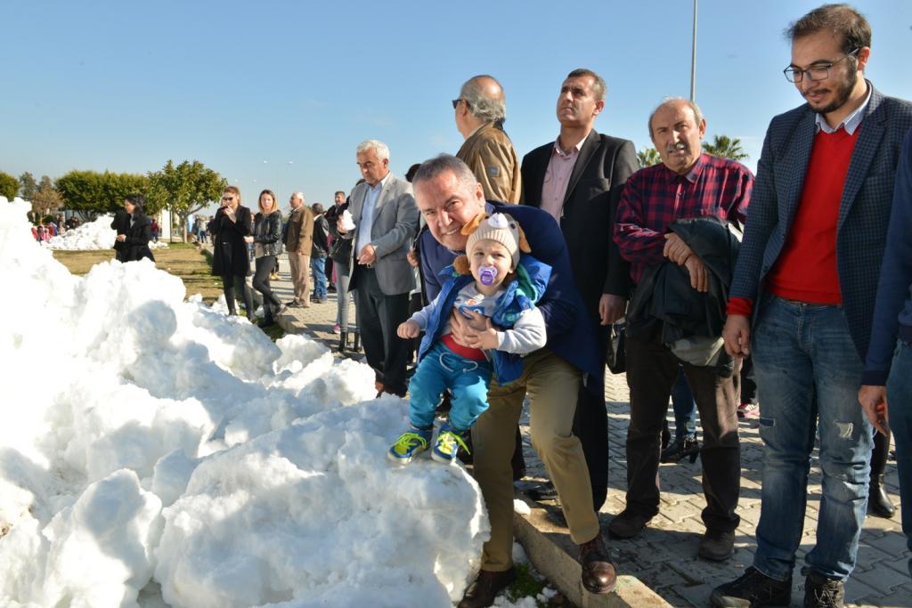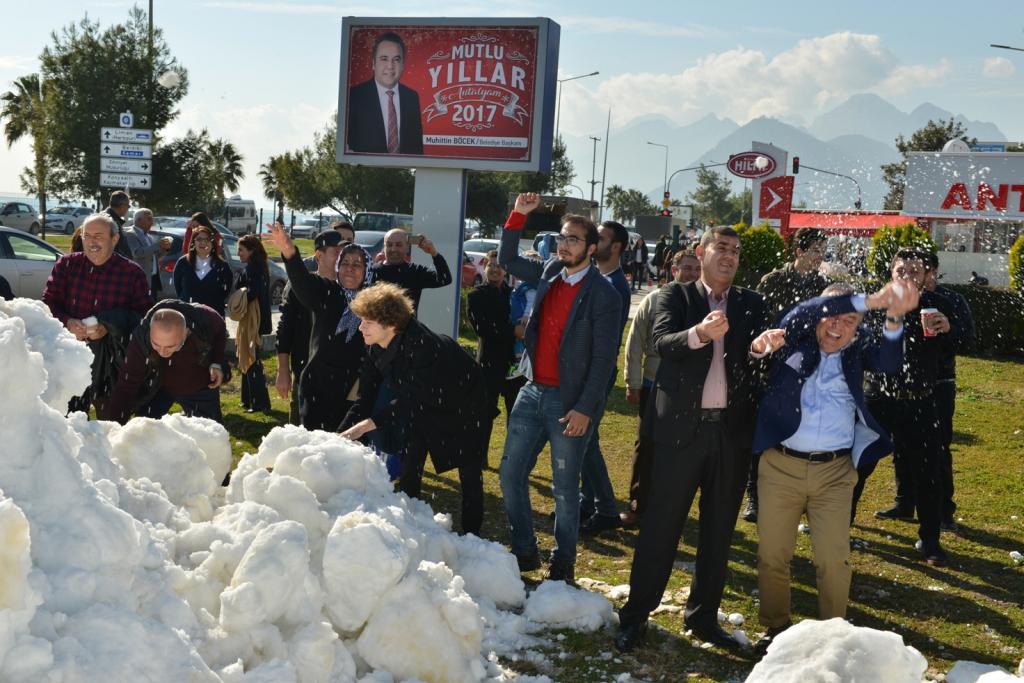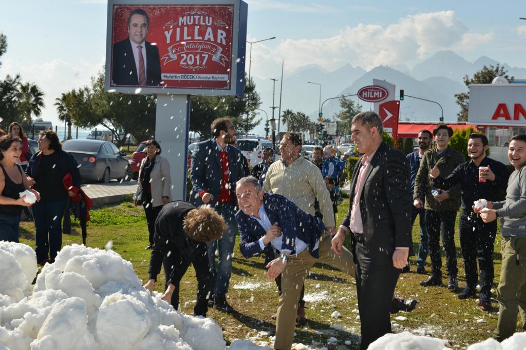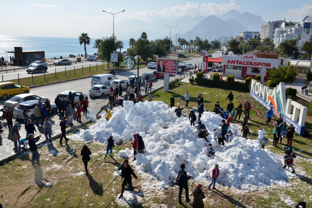 Konyaaltı Sahili’ne hemen 10 metre bir mesafede Konyaaltı Kent Meydanı’na 6 kamyon ile taşıdıkları kar’ın vatandaşlar tarafından büyük bir heyecanla karşılandığını ifade eden Muhittin Böcek, Meydan’da dağ gibi yığılan kar’ın üzerine çıkan vatandaşların kartopu ile keyifli saatler geçirdiklerini söyledi.