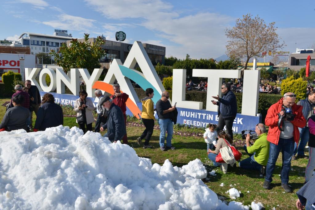 Antalya’da çokça duyduğumuz ‘4 mevsim bir arada’ sözü, Konyaaltı Belediyesi’nin sahile kar taşıması ile gerçek oldu. İlçe merkezinde ilk olarak okullara taşınan kar öğrencileri heyecana boğmuş, öğretmenler de çocukların bu heyecanına ortak olmuştu. Bu heyecanı sahile taşıyan Konyaaltı Belediyesi, Beydağları’ndan Konyaaltı Kent Meydanı’na 6 kamyon kar getirdi. Konyaaltı Sahili’ne 10 metre mesafede kartopu oynama fırsatı bulan vatandaşların heyecanına, Konyaaltı Belediye Başkanı Muhittin Böcek’te ortak oldu.