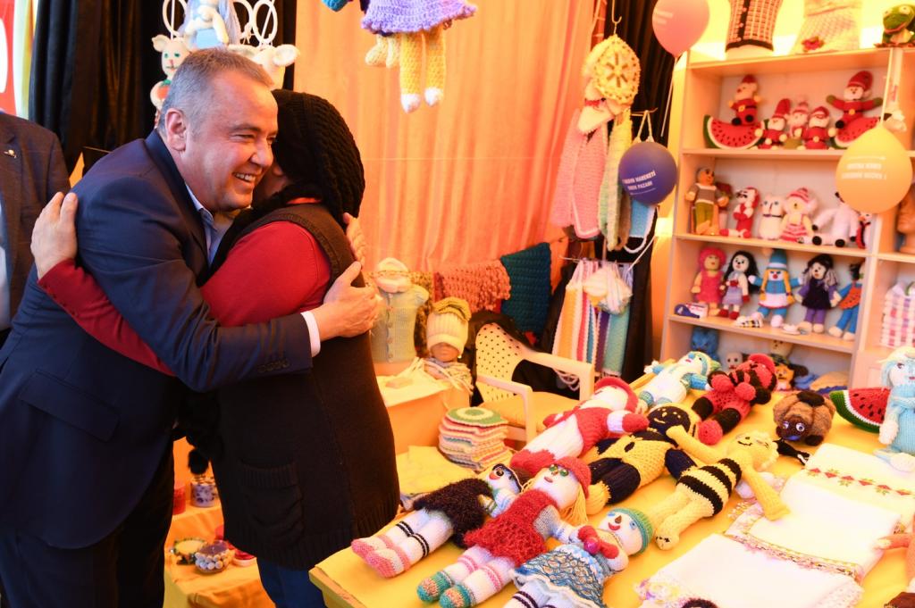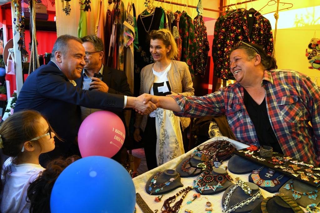 KADINLAR EKONOMİYE DEĞER KATIYOR Muhittin Böcek, 1 Kadın Hareketi Kadın Üretim ve Dayanışma Derneği işbirliğiyle açılışını gerçekleştirdikleri Kadın El Emeği Pazarı’nda kadınların yaptığı el işi ürünlerin satışının yapılacağını söyledi. Zamanlarının büyük bir bölümünü evde geçiren ev hanımlarına, yapmış oldukları el işi ürünlerini satarak aile ekonomilerine katkı koyma fırsatı verdiklerini belirten Başkan Muhittin Böcek, bunun da ötesinde kadınların sosyalleşerek stres ve sıkıntılardan uzaklaştıklarını kaydetti.