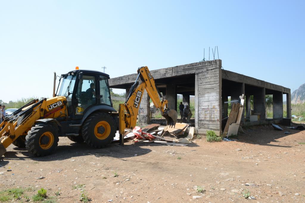 Metruk halde olan inşaata kurulan, çevre sağlığını da son derece olumsuz etkileyen, derme çatma depoyu iş makinesiyle yıkan zabıta ekipleri, etrafa saçılan hurda ve kağıt türü atıkları da toplayarak geri dönüşüme kazandırdı.