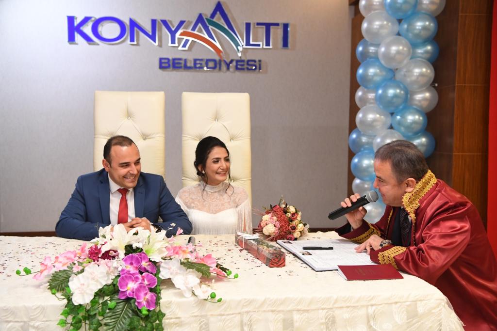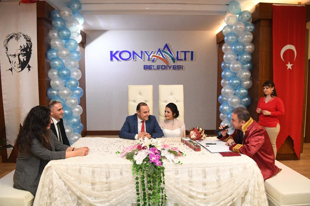 Konyaaltı Belediyesi, 14 Şubat Sevgililer Günü evlenmek için müracaatta bulunan çiftlere sürpriz hazırladı. Konyaaltı Belediye Başkanı Muhittin Böcek’in talimatıyla nikah akdinin gerçekleştirildiği Konyaaltı Belediyesi Feslikan Salonu balonlarla süslendi. Balonlardan oluşan kalplerin altında bol bol fotoğraf çekinen genç çiftler özel günlerini ölümsüzleştirmeyi de unutmadı.