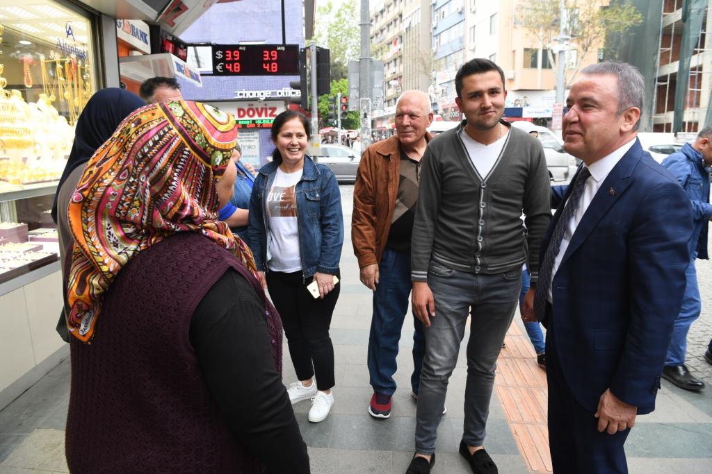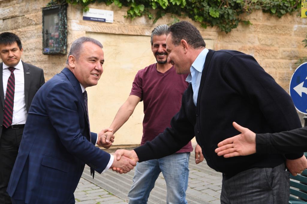 Kazım Özalp Caddesi’nde esnaf ve vatandaşlar tarafından büyük ilgiyle karşılanan Başkan Muhittin Böcek, Kale Kapısı’nda 48 yıldır ayakkabı boyacılığı yapan Oktay Topuz’u ziyaret etti. Ayakkabılarını boyatan Başkan Böcek, Topuz ile uzun süre sohbet etti. Ardından Kaleiçi Yat Limanı’na doğru yürüyen Başkan Böcek, Kaleiçi Taksi Durağı esnafını da ziyaret etti.
