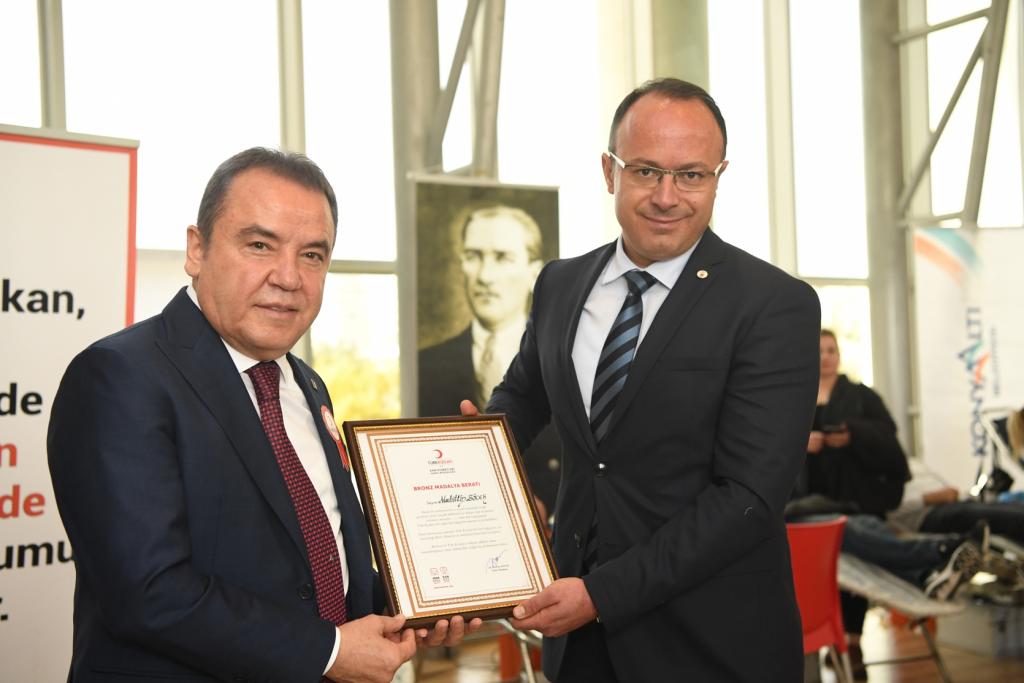 Türk Kızılay’ı Batı Akdeniz Bölge Müdürü Dr. Tufan Ertop, Konyaaltı Belediyesi ile her yıl güzel bir işbirliği sağladıklarını söyleyerek, kampanya destek veren Başkan Böcek’e teşekkür etti. Dr. Tufan Ertop, 12. kez kan bağışında bulunan Başkan Muhittin Böcek’e bronz madalya ve çiçek takdim etti. Başkan Böcek, daha sonra, Türk Kızılay’ı Batı Akdeniz Bölge Müdürü Dr. Tufan Ertop, Antalya Kan Merkezi Müdürü Dr. Erkan Kaya ve çalışanlarla günün anısına hatıra fotoğrafı çektirdi. Gün boyu birçok vatandaş Konyaaltı Belediyesi’ne gelerek, kan bağışında bulundu.