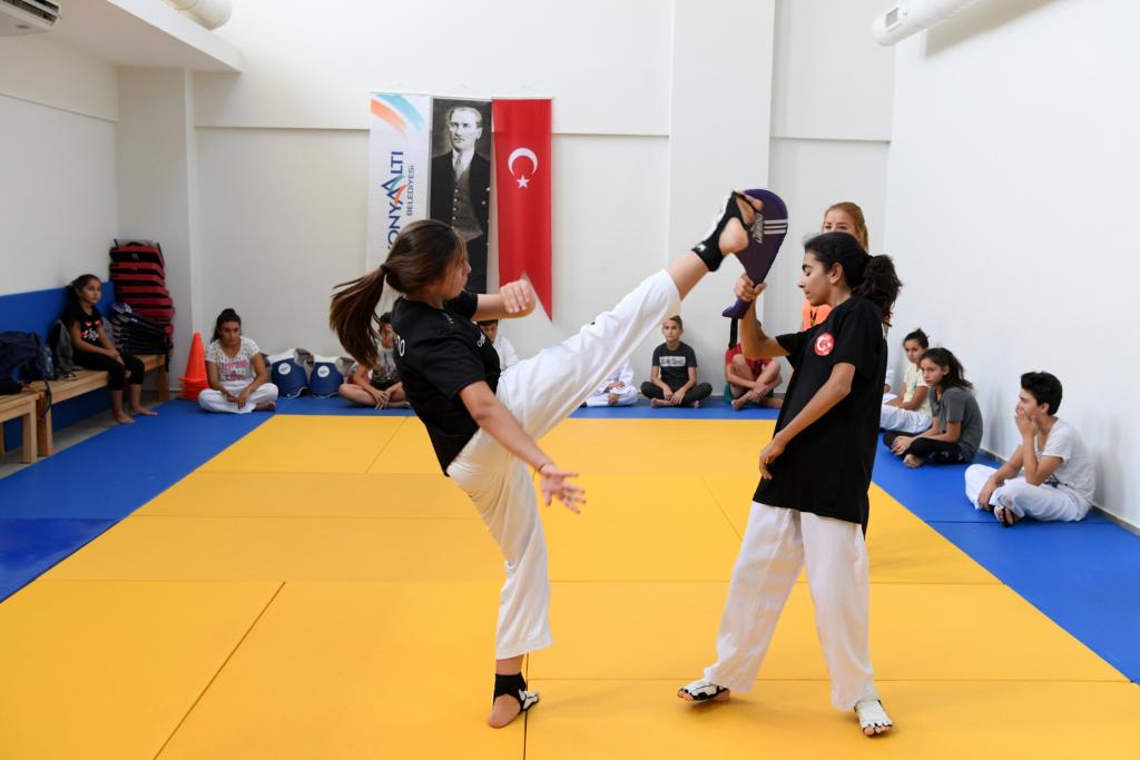 Konyaaltı Belediyesi Sanat Eğitim Merkezi (KONSEM) çatısı altında açılan teakwondo kursuna özellikle kız öğrenciler büyük ilgi gösteriyor. Konyaaltı Belediyesi Atatürk Stadyumu’nun kapalı salonunda eğitim gören öğrenciler, temel savunma tekniklerini öğreniyor.