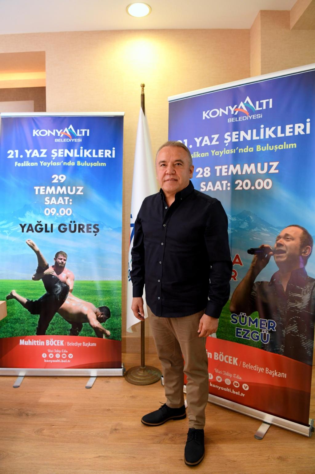 Konyaaltı Belediye Başkanı Muhittin Böcek, Konyaaltı Belediyesi tarafından bu yıl 21.si düzenlenecek olan Feslikan Yaylası Yaz Şenlikleri ile ilgili basın toplantısı düzenledi. Konyaaltı Belediye Başkanı Muhittin Böcek, bu yıl 21'incisi düzenlenecek olan Yaz Şenlikleri'nin 28-29 Temmuz günlerinde Feslikan Yaylası’nda yapılacağını belirtti. Şenliğin önceki yıllara göre daha renkli geçeceğini, tüm hazırlıkların tamamlandığını anlatan Başkan Böcek, izlemeye gelecek Antalyalıların 1850 metre yükseklikte üşümemeleri içinde yanlarında kalın kıyafetler getirmeleri uyarısında buldu.