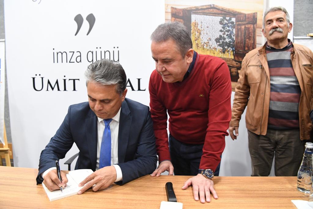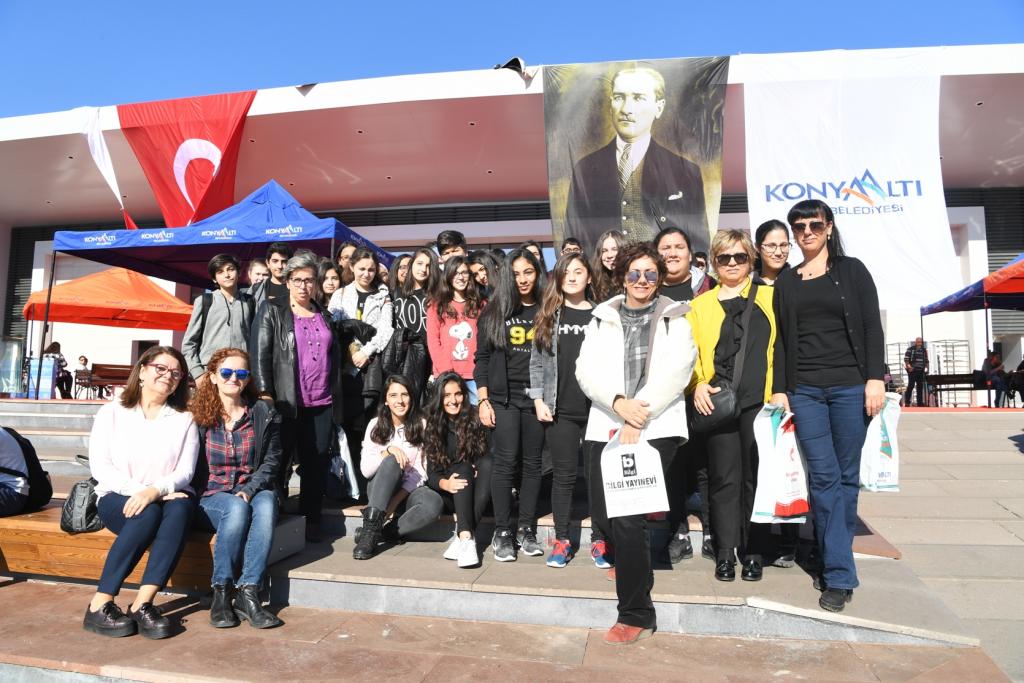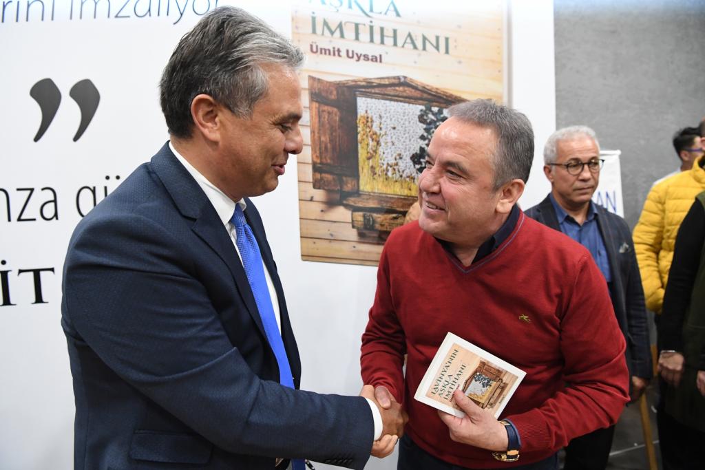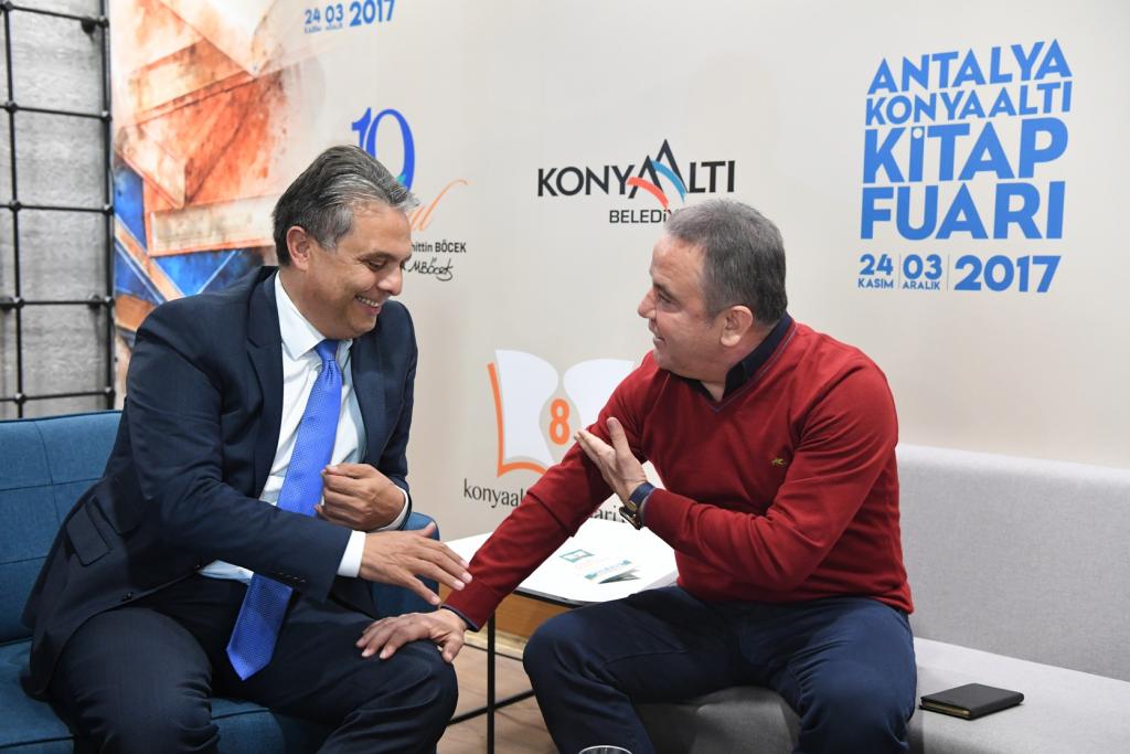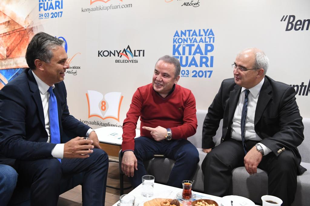 Fuarda kitap severleri Belediye standında karşılayan Konyaaltı Belediye Başkanı Muhittin Böcek, ziyaretçilerle tek tek ilgileniyor. “Antalya Konyaaltı Kitap Fuarımız 8 yaşında” diyen Başkan Muhittin Böcek, 9 ay gibi kısa bir süre içinde yapımı tamamlanan Konyaaltı Fuar ve Kongre Merkezi’nde açılan fuarın Antalyalılardan büyük ilgi gördüğünü söyledi. 130’un üstünde yazarın katılacağı Fuarın 3 Aralık Pazar gününe kadar ziyaretçilere açık olacağını dile getiren Muhittin Böcek, Fuarın ilk bir haftasında on binlerce kitap severi sevdikleri yazarlar ile buluşturduklarını kaydetti. Son olarak Muratpaşa Belediye Başkanı Ümit Uysal’ı da Antalya Konyaaltı Kitap Fuarı’nda yazar olarak ağırladıklarını dile getiren Başkan Böcek, Lavinya’nın Aşkal İmtihanı kitabının yazarı Ümit Uysal’ı bir kez daha tebrik ederek, başarılarının devamını diledi. 2-3 Aralık günlerinde yine bir birinden değerli yazarları Fuar alanında ağırlayacaklarını belirten Başkan Muhittin Böcek, tüm Antalyalıları Fuarı ziyaret etmeye davet etti.