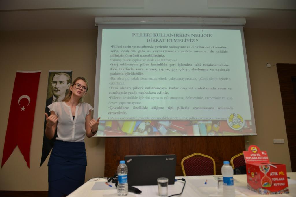 Konyaaltı Belediyesi, atık pillerin geri dönüşüme kazandırılmasını sağlamak amacıyla eğitimcilere yönelik seminer düzenledi. Taşınabilir Pil Üreticileri ve İthalatçıları Derneği (TAP) işbirliğiyle düzenlenen seminer de konuşan Çevre Mühendisi Seyhan Öz Ulucan, atık pillerin toplanması, taşınması ve bertaraf edilmesiyle ilgili öğretmenleri bilgilendirdi. Kullanım ömrünü tamamlayan atık pillerin çöplere atılmaması gerektiğini belirten Ulucan , “Atık pillerin kontrolsüz biçimde atılması, çevre kirlenmesine yol açıyor. Bu şekilde atılan pillerin dış kabı zamanla delinerek, bünyelerindeki ağır metaller ve kimyasal maddeler toprağa sızarak yer altı sularını kirlenmesine neden oluyor” diye konuştu.
