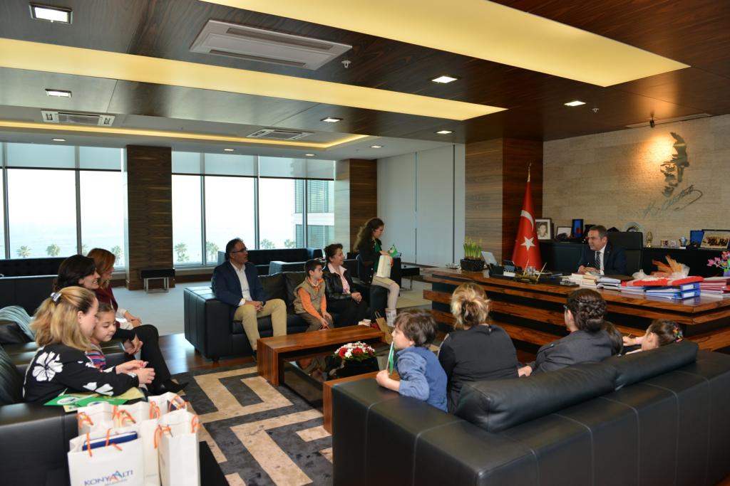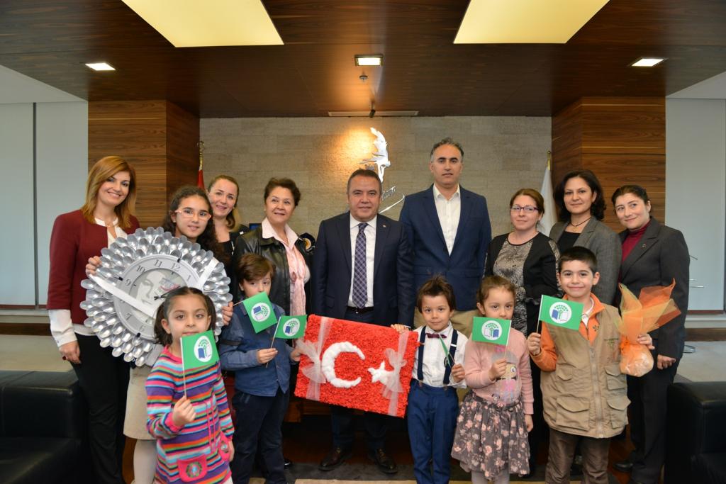 Türkiye Çevre Eğitim Vakfı (TÜRÇEV) ve Milli Eğitim Bakanlığı tarafından yürütülen “Eko-Okul” projesi kapsamında Konyaaltı’nda bulunan okul temsilcileri Konyaaltı Belediye Başkanı Muhittin Böcek’i ziyaret etti. TÜRÇEV Antalya Temsilcisi Lokman Atasoy, çevre bilincinin çocuk yaşta oluşturulması gerektiğini, bu konuda yerel yönetimlerinin desteklerinin önemli olduğunu dikkat çekerken, Konyaaltı Belediyesi’nin bu konuda önemli çalışmalar yaptığını kaydetti. Ziyarete gelen öğrenciler, Başkan Muhittin Böcek’e geri dönüşümlü malzemelerden yapmış oldukları eşyaları hediye etti.