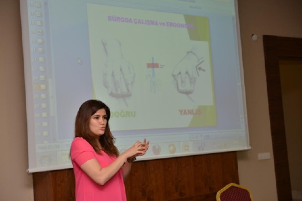Ofis ortamında çalışırken doğru biçimde oturmanın önemi; bilgisayar, telefon ya da benzeri ofis eşyası kullanırken ise alınması gereken pozisyon hakkında bilgiler veren Birsen Kanat, iş hayatında ihmal edilen küçük ayrıntıların ilerleyen süreçlerde meslek hastalıklarına neden olabileceğine dikkat çekti. Masa başında çalışan kişilerin gün içinde fiziksel hareketler yapması gerektiğini dile getiren Kanat, bu hareketlerin bir kaçını belediye personeline uygulamalı olarak anlattı. İş Güvenliği Uzmanı Kanat, yangın öncesi ve de yangın esnasında alınacak tedbirler konusunda da belediye personelini bilgilendirdi.