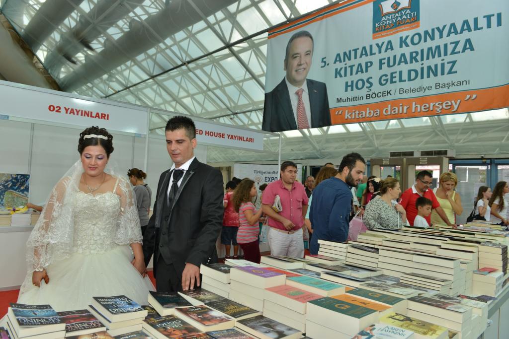 19 Eylül Cuma günü kapılarını Antalyalılara açan Antalya Konyaaltı Kitap Fuarı’nda onlarca yazar ve fikir adamı kitap severlerle buluşuyor. Konyaaltı Belediyesi tarafından bu yıl beşincisi düzenlenen Antalya Konyaaltı Kitap fuarında zaman zaman renkli görüntüler de ortaya çıkıyor. Dünya evine giren Bilgi Çetin ve Hazilet Şahin çifti düğün öncesi Kitap Fuarı’nı ziyaret etti.