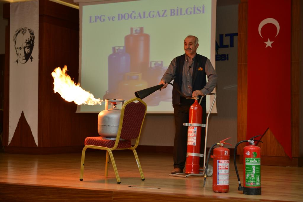Eğitim ve Önleme Şube Müdürlüğü’nde görevli konusunda uzman Şaban Kibar, belediye hizmet binalarında ve evlerde meydana gelebilecek her türlü yangının söndürülmesi, doğalgaz ve LPG kaçaklarına nasıl müdahale edileceği, yanan bir canlıya nasıl müdahale edilmesi gerektiği, binaların en güvenli şekilde tahliye edilmesi gerektiği, binalarda alınması gereken yangın önlemleri ve yangın söndürme sistemlerinin kullanılması konularında görsel ve tatbiki eğitim verdi.