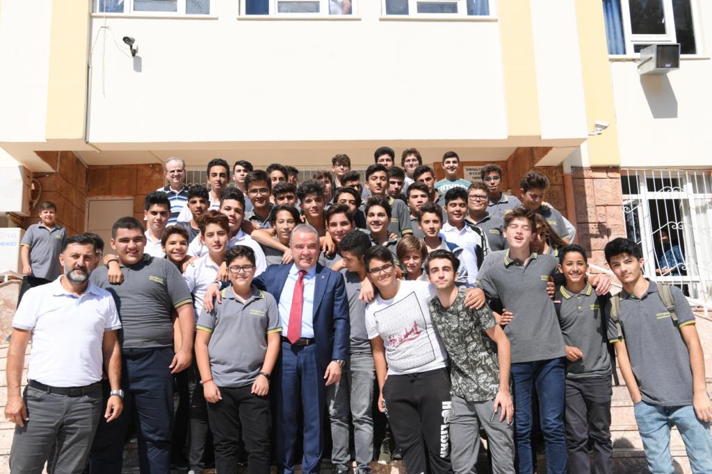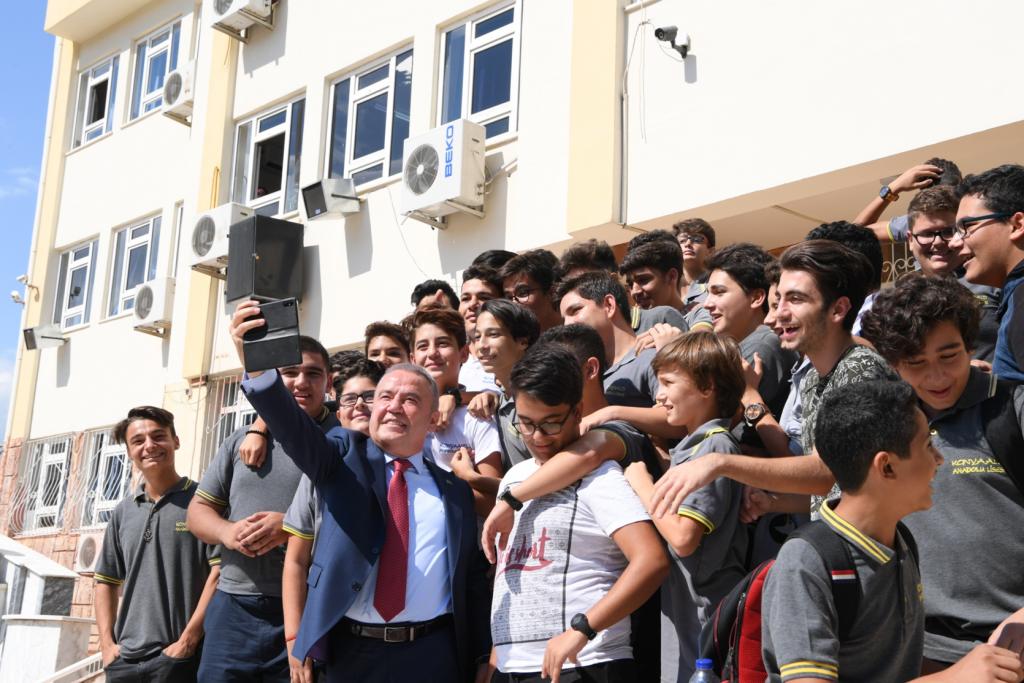 Konyaaltı’nda eğitim-öğretime ayrı bir önem verdiğini söyleyen Başkan Böcek, “Devletin lisesinin olmadığı günlerden bugünlere kadar birçok eğitim yatırımının önünü açtık, destek olduk. Şimdi Konyaaltı’nda 53 tane okul var. Eğitime katkı sunan herkese teşekkür ederim. Yeni eğitim-öğretim yılının öğretmen ve öğrencilerimize hayırlı olmasını dilerim” diye konuştu. Konuşmaları sonrasında okul bahçesine çıkan Başkan Muhittin Böcek’e öğrenciler büyük ilgi gösterdi. Başkan Böcek’te öğrencilerle öz çekim yaparak bu anı ölümsüzleştirdi.