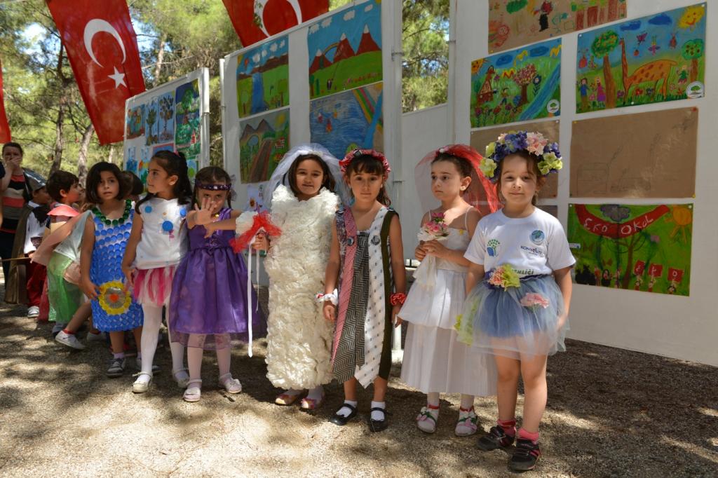 Öğrencilerin kortej yürüyüşüyle başlayan şenlikte anaokulu öğrencilerinin gösterileri büyük ilgi gördü. Atık malzemelerin elbiseye dönüştürüldüğü defilede, minik öğrenciler elbiseleri üzerlerine giyerek sergiledi.