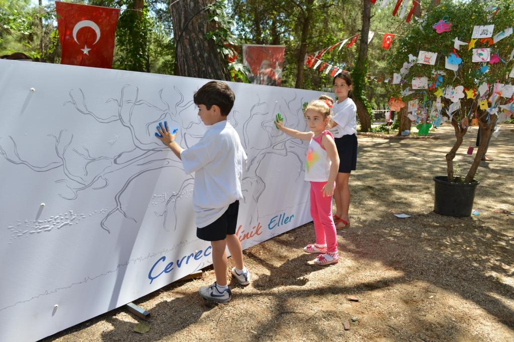 Şenlik alanında oluşturulan dev tuvale el izlerini bırakan öğrenciler, geri dönüşüm bowling, halat çekme, çuval yarışı, geri dönüşüm parkur oyunlarıyla doyasıya eğlendi.