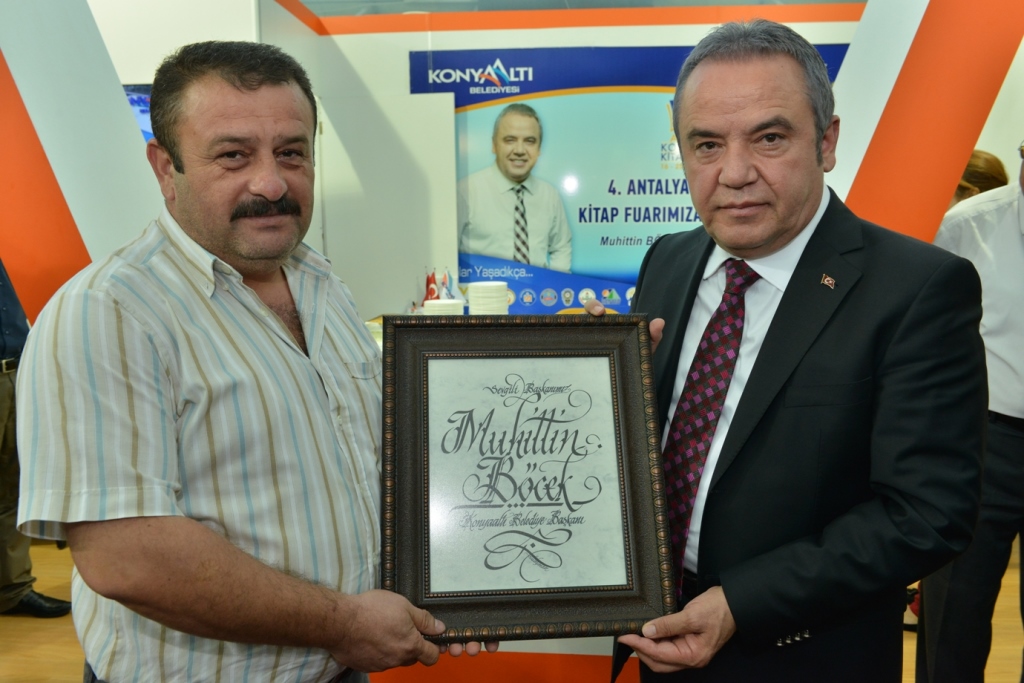 Konuşmasının ardından yayınevi temsilcilerine ve yazarlara tatlı ikram eden Başkan Böcek’e katılımcılar teşekkür etti. Fuarda yer alan stant temsilcileri ve yazarlar, 10 gün süreyle kendilerini ağırlayan ve her türlü desteği esirgemeyen Başkan Böcek’e, el yazısı ile isminin yazılı olduğu bir şilt hediye ederek teşekkür ettiler.
