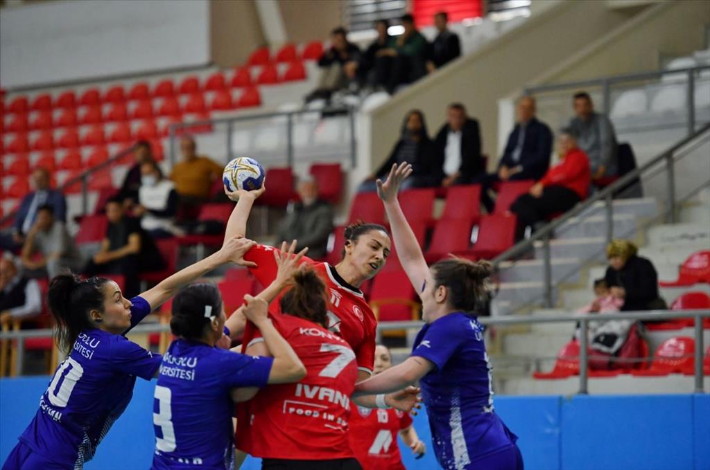 Konyaaltı Belediye Spor Kulübü Kadın Hentbol Takımı, Avrupa mesaisinin ardından lige geri döndü. EHF Avrupa Kupası’nda çeyrek finale kalan Mavi Kelebekler, ligin 15’nci hafta maçında Anadolu Üniversitesi GSK’ye konuk oldu. Maçın ilk yarısını 15-12 önde kapatan Mavi Kelebekler 35-24 skorla galibiyeti kazandı. Süper Lig’de 12 maçtır mağlup olmayan Mavi Kelebekler, tarihinde ilk kez katıldığı Avrupa kupalarında da rakiplerine 8 maçtır galibiyet sevinci yaşatmadı. Anadolu Üniversitesi GSK maçında takımın en skoerer oyuncusu 6 golle Michaella Eunice Magba oldu. Mavi Kelebekler, bir sonraki lig maçında Görele Belediye SK’yı, 13 Mart Pazartesi günü saat 14.00'te Akdeniz Üniversitesi Mavi Salon’da ağırlayacak. Hentbolseverler karşılaşmayı, Konyaaltı Belediyesi sosyal medya hesapları ve Youtube kanalından canlı olarak takip edebilecek.