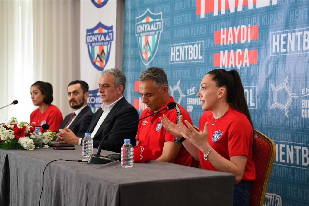 Kulüp tarihinde ilk kez Avrupa’da mücadele eden Konyaaltı Belediye SK Kadın Hentbol Takımı’nda final heyecanı yaşanıyor. İspanya temsilcisi Atletico Guardes ile deplasmanda oynanan ve 23-17 skorla kaybedilen maçın Antalya’da oynanacak rövanş mücadelesi öncesinde düzenlenen basın toplantısında Konyaaltı Belediye Başkanı Semih Esen, Konyaaltı Belediye Spor Kulübü Başkanı Şevket Korkut, Kadın Hentbol Takımı Başantrenörü Birol Ünsal ve takım kaptanları Monica Janeska Kıldan ile Yasemin Şahin basın mensuplarının sorularını yanıtladı. Türk hentbolu adına çok önemli bir maça çıkacaklarının altını çizen Konyaaltı Belediye Başkanı Semih Esen, takımın motivasyonunun son derece yüksek olduğunu ve Antalyalı sporseverlerin desteğiyle kupayı alan taraf olacaklarına inandığını söyledi. İspanya’da oynanan ilk maçta tam bir hakem faciası ile karşılaştıklarını belirten Başkan Esen, ‘’Maçın ilk 10 dakikasında takımımız sürekli hücum fauller ile durdurulmaya çalışıldı ve bu durum maç boyunca devam etti. Maçtan sonra konuştuğumuz spor adamları çalınan faullerin yüzde 80’inin faul olmadığını söyledi. Adil bir yönetimle kupayı alacağımıza inanıyoruz’’ dedi.