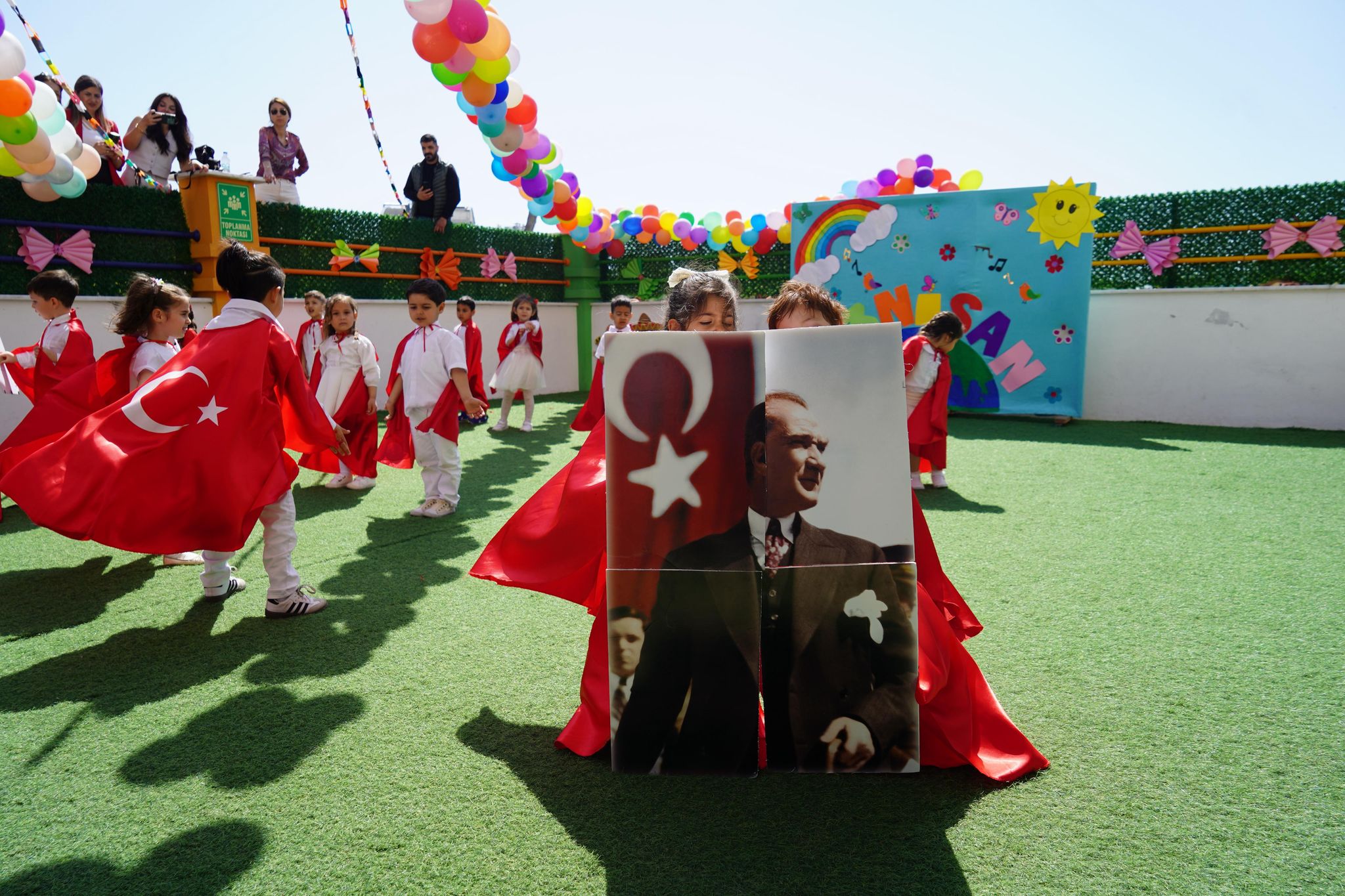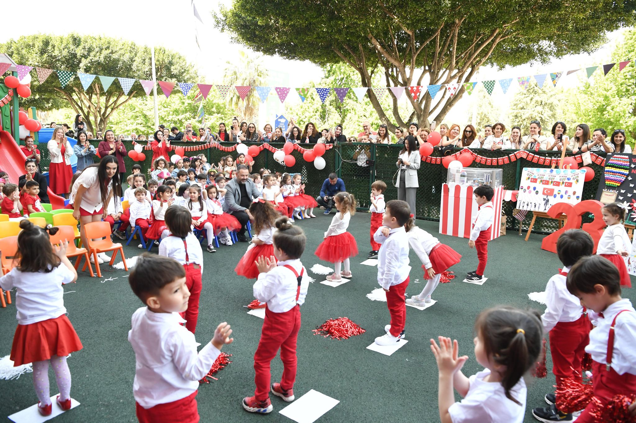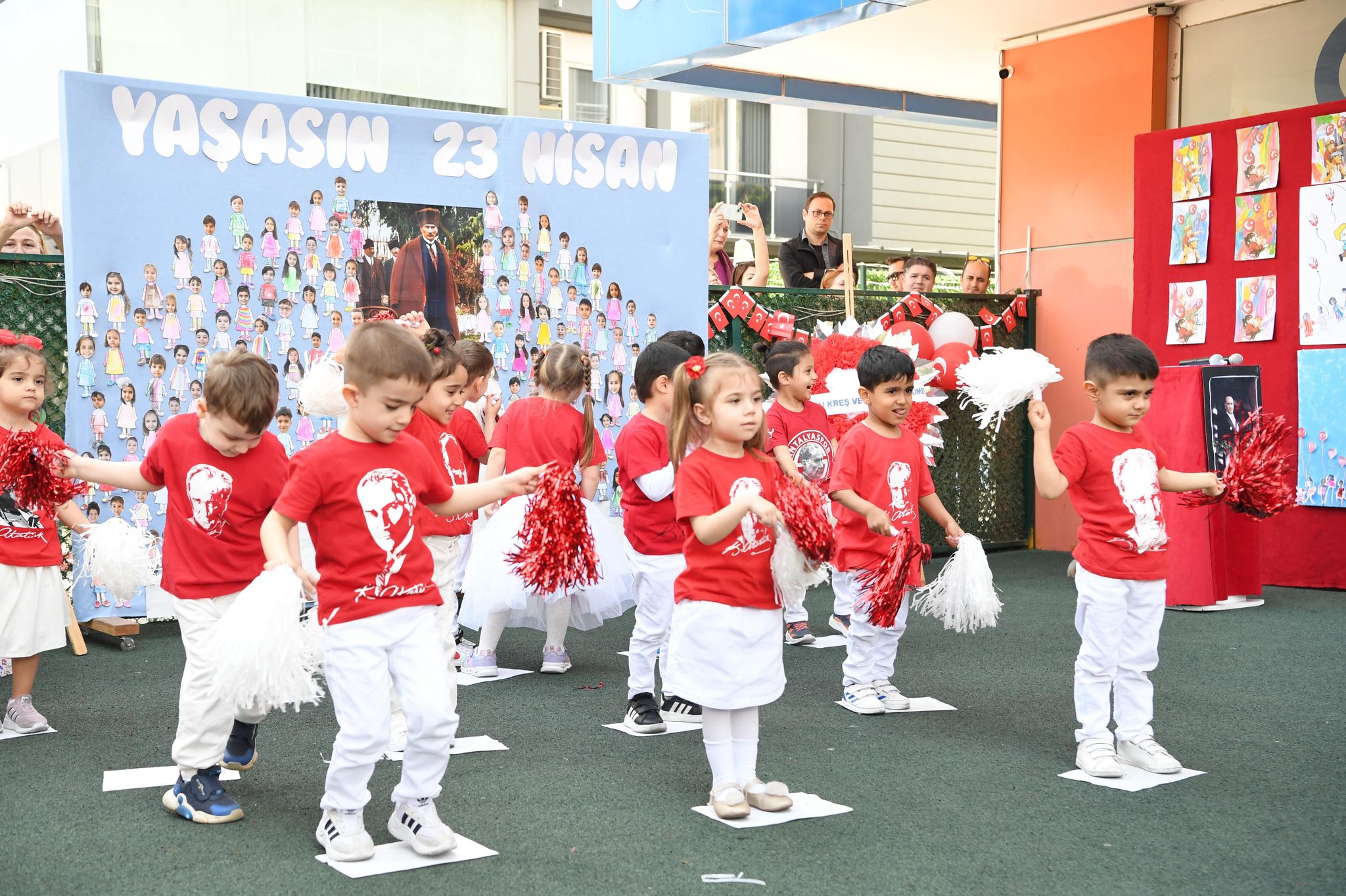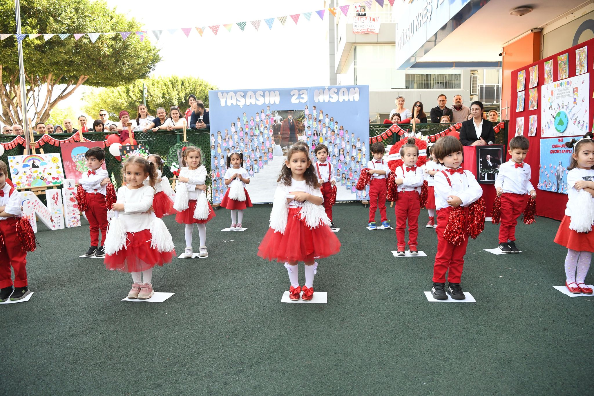 Kreşlerde miniklerin renkli gösterileriyle şenlenen etkinlikler, saygı duruşu ve İstiklal Marşı’nın okunmasıyla başladı. Ardından bayraklarla gerçekleştirilen kortej yürüyüşüyle devam etti. Kreş öğrencileri, öğretmenleri eşliğinde hazırladıkları dans ve müzik gösterileriyle izleyenlere unutulmaz anlar yaşattı. Renkli kostümlerle sahne alan minikler, ailelerinden büyük alkış aldı.