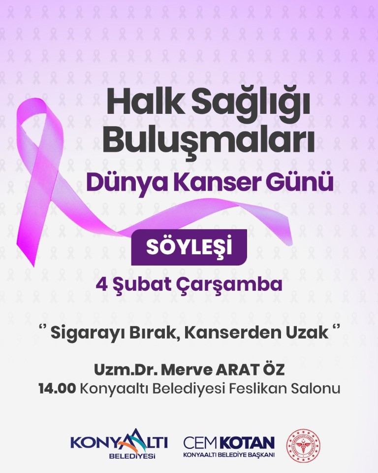 Kanserle mücadelede en etkili yolun bilinçlenme ve erken önlem olduğuna inandıklarını vurgulayan Konyaaltı Belediye Başkanı Cem Kotan, “4 Şubat Dünya Kanser Günü’nde, alanında uzman doktorumuzun da katılımıyla düzenleyeceğimiz bu söyleşiyle hem farkındalık oluşturmayı hem de sağlıklı yaşam alışkanlıklarını güçlendirmeyi amaçlıyoruz. Özellikle sigara kullanımının zararları ve kanserle ilişkisi konusunda önemli bilgiler paylaşılacak. Tüm vatandaşlarımızı bu anlamlı buluşmaya davet ediyorum” ifadelerini kullandı.