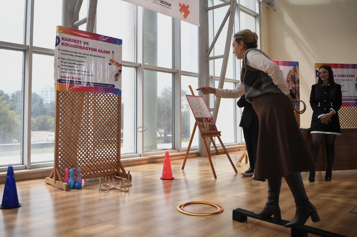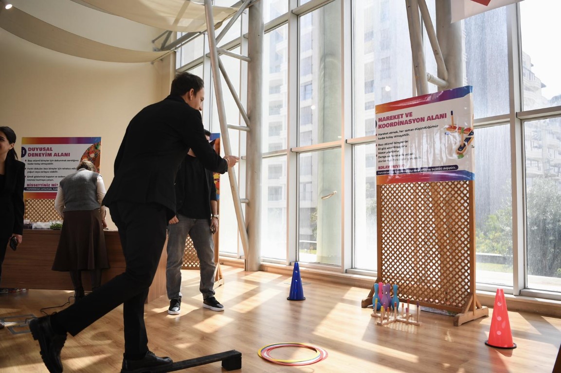 Etkinlik kapsamında oluşturulan deneyim parkurlarında katılımcılar, otizmli bireylerin günlük yaşamda karşılaşabildiği duyusal, dikkat, algı, sosyal iletişim ve motor koordinasyon farklılıklarını uygulamalı olarak deneyimleme fırsatı buldu. Duyusal dokunma istasyonunda yalnızca dokunarak nesne bulmaya çalışan ziyaretçiler, farklı dokuların bazı bireyler için ne kadar yoğun ve zorlayıcı olabileceğini hissetti. Dikkat ve ses istasyonunda arka plandaki sesler eşliğinde verilen görevleri tamamlamaya çalışan katılımcılar, odaklanma güçlüğünü deneyimlerken; görsel karmaşa alanında dikkat dağıtıcı unsurlar arasında hedef nesneyi bulmaya çalışarak algısal yoğunluğu gözlemledi. Sosyal anlama mini deneyiminde beden dili ve sosyal ipuçlarının farklı yorumlanabileceğine dikkat çekilirken, hareket ve koordinasyon alanında ise halka takma ve hedef vurma gibi uygulamalarla motor planlama ve el-göz koordinasyonundaki farklılıklar deneyimlendi.