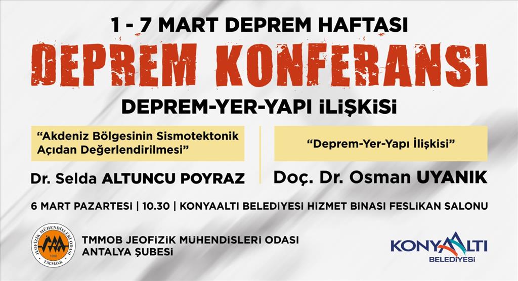 Deprem Haftası’nda her yıl 1-7 Mart tarihleri arasında düzenlenen çeşitli etkinliklerle toplumda depreme yönelik bilinçlenme ve farkındalığın oluşması amaçlanıyor. Kahramanmaraş merkezli meydana gelen iki büyük depremin ardından afetten önce ve sonra neler yapılması gerektiği daha da önem kazanırken, sivil savunmaya yönelik çalışmalar da hız kazandı. Bu nedenle depremle ilgili toplumsal bilinci artırmak için Konyaaltı Belediyesinin ev sahipliğinde ‘Deprem Konferansı’ düzenlenecek. Konferans, Türk Mühendis ve Mimar Odaları Birliği (TMMOB) Jeofizik Mühendisleri Odası Antalya Şubesi ile Konyaaltı Belediyesinin iş birliğinde 6 Mart Pazartesi günü Nazım Hikmet Fuar ve Kongre Merkezinde düzenlenecek. Halka açık ve ücretsiz bir şekilde gerçekleştirilecek konferansta, Dr.