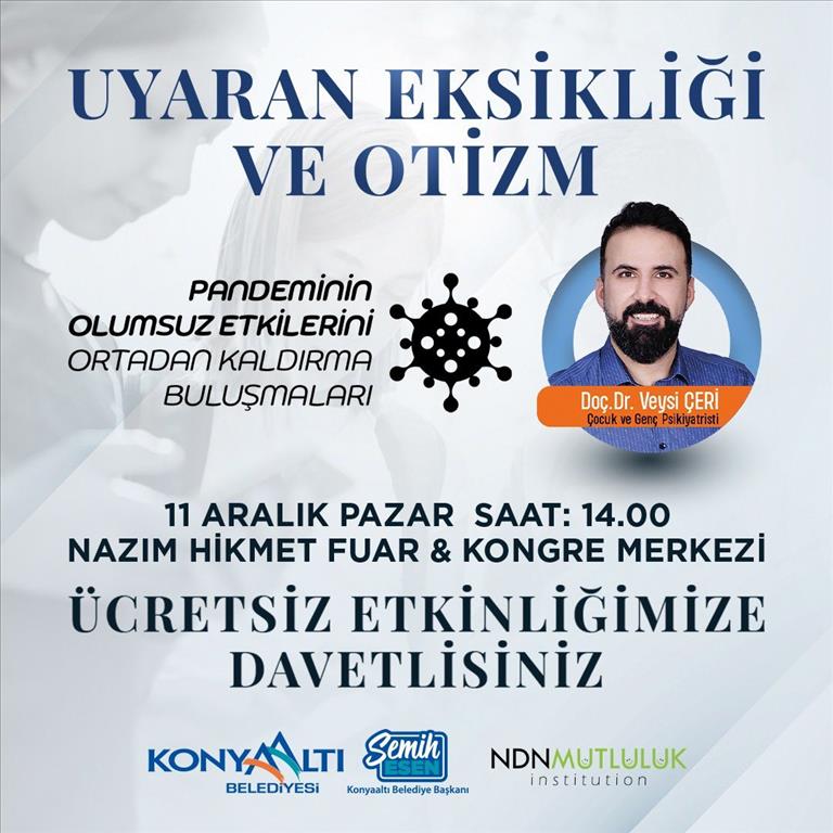 Konyaaltı Belediyesi, ‘’Pandeminin olumsuz etkilerini ortadan kaldırma buluşmaları’’ kapsamında çeşitli etkinlikler düzenleyerek vatandaşları bilgilendiriyor. Geçtiğimiz günlerde vatandaşların yoğun katılımıyla ‘’Teknoloji Bağımlılığı’’ konusunu ele alarak başlayan buluşmalar, ‘’Uyaran Eksikliği ve Otizm’’ başlıklı seminer ile devam edecek. Çocuk ve Genç Psikiyatristi Doç. Dr. Veysi Çeri’nin konuşmacı olarak katılacağı seminer 11 Aralık Pazar günü saat 14:00’te Nazım Hikmet Fuar ve Kongre Merkezi’nde başlayacak.