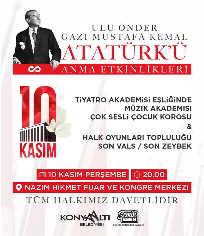 Türkiye Cumhuriyeti’nin kurucusu Gazi Mustafa Kemal Atatürk, ebediyete intikalinin 84’üncü yıl dönümünde Nazım Hikmet Fuar ve Kongre Merkezi’nde düzenlenecek tören ve etkinliklerle anılacak. Konyaaltı Belediyesi Atatürk’ü anma etkinlikleri kapsamında düzenlenecek etkinliklerde ilk olarak Tiyatro Akademisi eşliğinde Müzik Akademisi Çok Sesli Çocuk Korosu sahne alacak. 10 Kasım Perşembe günü saat 20.00’de başlayacak etkinlikler, Çok Sesli Çocuk Korosu’nun ardından Konyaaltı Belediyesi Halk Oyunları Topluluğu’nun Son Vals/Son Zeybek oyunuyla devam edecek. Ulu Önder Gazi Mustafa Kemal Atatürk’ü ebediyete intikalinin yıl dönümünde çok özel etkinliklerle kendisine yakışır bir şekilde anacaklarını ifade eden Konyaaltı Belediye Başkanı Semih Esen, “84 yıl önce aramızdan ayrılan Gazi Mustafa Kemal Atatürk hala kalplerimizin en güzel köşesinde yaşamaya devam ediyor.