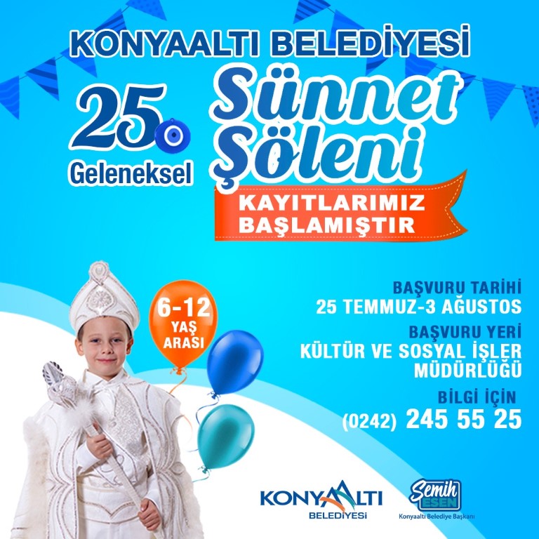 Her yıl yüzlerce çocuğun sünnetini üstlenen Konyaaltı Belediyesi, bu yılki sünnet töreni için de kayıtları almaya başladı. Başvuruların 3 Ağustos’a kadar süreceği bildirilirken, kayıt yapmak isteyen ailelerin Konyaaltı Belediyesi Kültür ve Sosyal İşler Müdürlüğü’ne bizzat gitmesi gerektiği belirtildi. Her hizmeti insanların gerçek ihtiyaçlarına yönelik yaptıklarını ifade eden Konyaaltı Belediye Başkanı Semih Esen, düzenledikleri sünnet şöleni ile çok sayıda çocuğu ücretsiz sünnet ettirdiklerini dile getirdi. Başkan Esen, sünnet törenine katılacak çocukları şimdiden tebrik ettiğini söyledi. Bu yıl 25’incisi yapılacak Sünnet Şöleni’nde 6-12 yaş grubu çocuklar için ailelerin kimlikleriyle birlikte Konyaaltı Belediyesi Kültür ve Sosyal İşler Müdürlüğü'ne müracaat etmeleri gerekiyor.