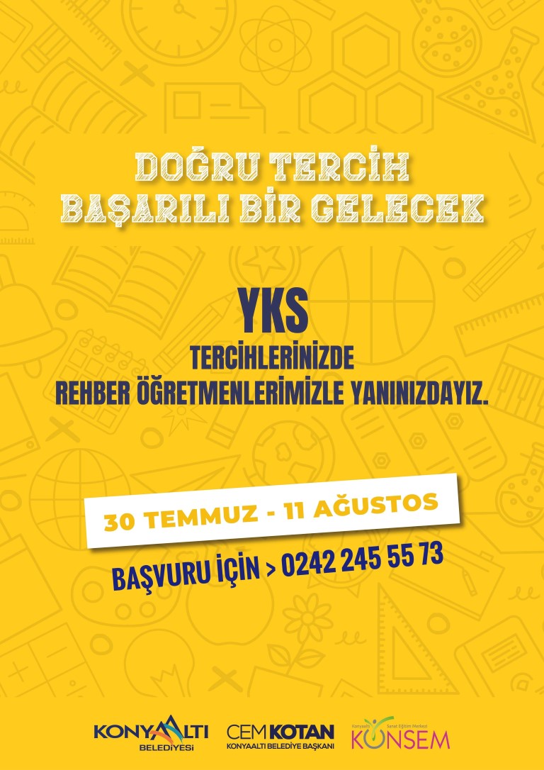 Konyaaltı Belediyesi, gerek Liselere Geçiş Sistemi (LGS) gerekse de Yükseköğretim Kurumları Sınavı (YKS) hazırlık süreci boyunca verdiği ücretsiz eğitim desteğinin yanı sıra, tercih desteğiyle de öğrencilerin yanında olmaya devam ediyor. Bünyesine bağlı Gürsu Etüt Merkezi’nde öğrencileri YKS’ye hazırlayan Konyaaltı Belediyesi, her yıl olduğu gibi bu yıl da tercih dönemi boyunca mezunların yanında olacak. “Doğru Bir Tercih Başarılı Bir Gelecek” başlığıyla resmi sosyal medya hesaplarından duyuru yapan Konyaaltı Belediyesi, 30 Temmuz - 11 Ağustos tarihleri arasında Gürsu Etüt Merkezi’nde tercih desteği sağlayacak. Destek almak isteyen öğrencilerin, 0242 245 55 73 numaralı telefondan detaylı bilgi eşliğinde randevu almaları yeterli olacak. Öte yandan Gürsu Etüt Merkezi’nden edinilen bilgiye göre, hizmetten yararlanmak isteyen öğrencilerin Konyaaltı’nda ikamet etme zorunluluğu aranmayacak.