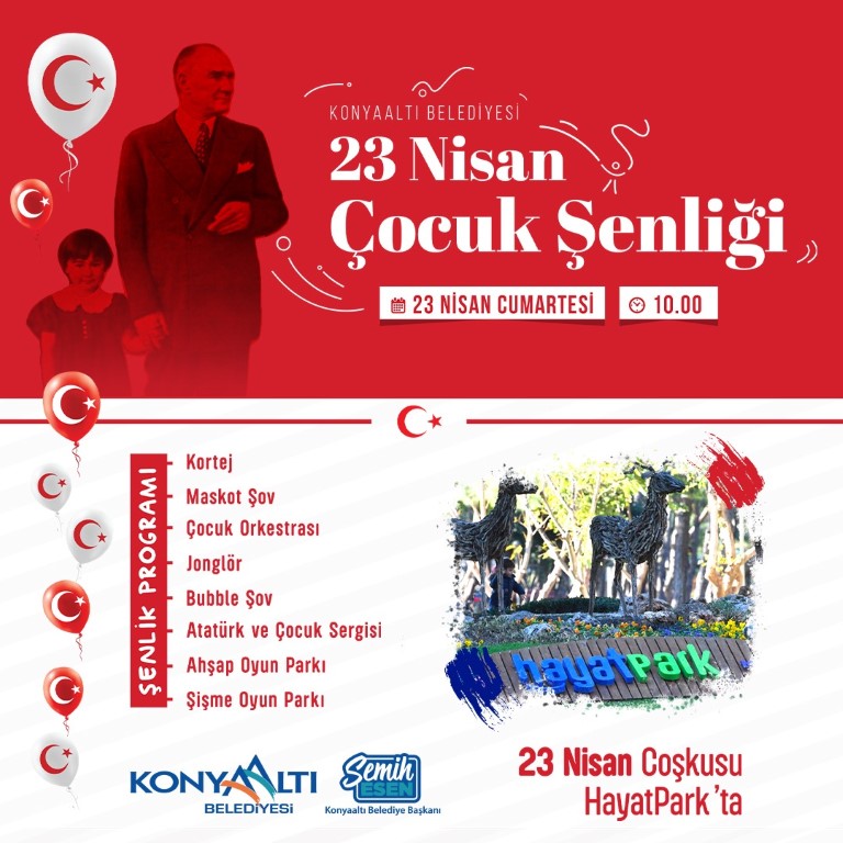 Konyaaltı Belediyesi, 23 Nisan Ulusal Egemenlik ve Çocuk Bayramı ve Türkiye Büyük Millet Meclisi’nin 102’nci açılış yıl dönümünü HayatPark içerisinde hazırladığı birbirinden renkli gösterilerle, binlerce vatandaşın ve çocukların katılımıyla kutlandı. Saat 10:00’da Konyaaltı Belediye Başkanı Semih Esen’in, Cumhuriyet Halk Partisi İl Başkanı Nuri Cengiz ile birlikte katıldığı kortej ile başlayan etkinlikler, çocuklara yönelik gösterilerle devam etti. HayatPark içerisinde farklı noktalarda gün boyu süren etkinlikler, çocuk maskot şovu, çocuk orkestrası, jonglör, balon şovu, Atatürk ve çocuk sergisi, ahşap oyun parkı ve şişme oyun parkı gibi eğlenceli aktivitelerle devam ederek çocukların keyifli bir bayram geçirmelerini sağladı. Etkinlik alanlarını tıklım tıklım dolduran çocuklar ve ebeveynleri, HayatPark içerisinde renkli görüntüler oluşturdu.