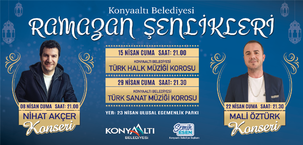 Ramazan Şenlikleri’nde ilk konser 8 Nisan Cuma günü saat 21:00’de Nihat Akçer ile başlayacak. Şenliklerin ikinci haftasında 15 Nisan Cuma günü saat 21.30’da Konyaaltı Belediyesi Türk Halk Müziği Korosu sahne alacak.