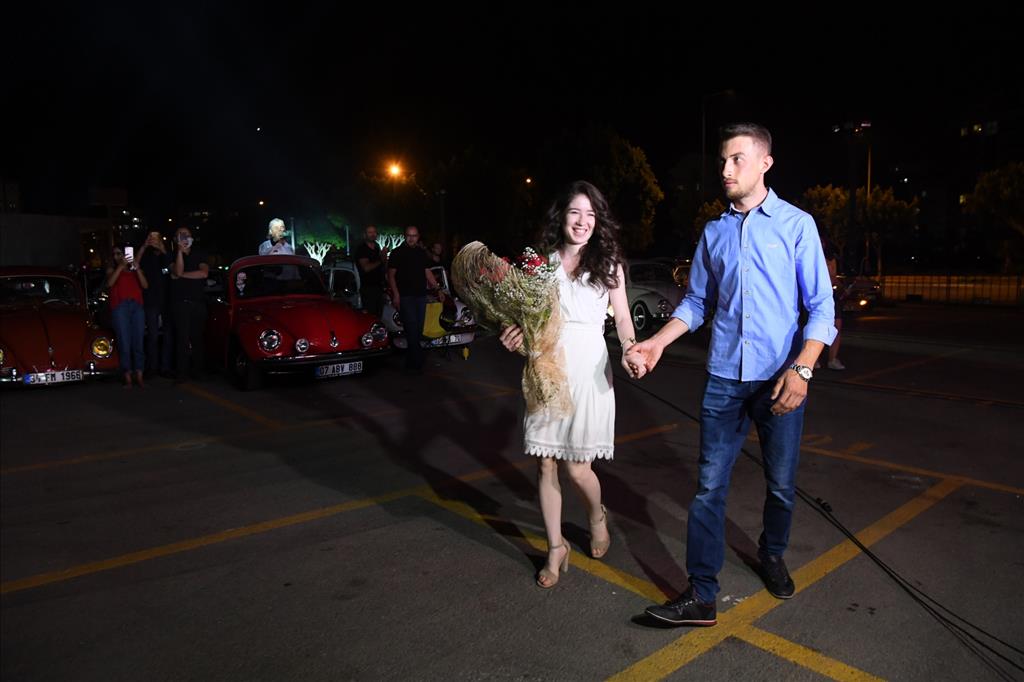 Hasan Çetinkaya, aracında her şeyden habersiz film izleyen kız arkadaşı İmran Turaç’ı beyaz perdenin önüne davet etti.