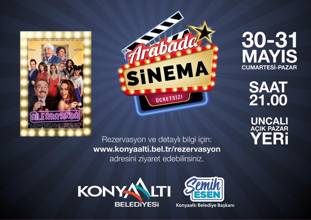 Konyaaltı Belediyesi ‘arabada sinema’ etkinliğiyle sinemaseverleri yeniden beyaz perde ile buluşturacak. İlk gösterim 30 Mayıs Cumartesi akşamı saat 21.00’de Uncalı Mahallesi’ndeki açık pazar yerinde gerçekleştirilecek. Araçlarıyla alana alınacak vatandaşlar, yine araçlarının içinde dev perdeye yansıtılacak filmi izleyebilecek. Koronavirüs tedbirleri kapsamında araçlar içinde 3 kişinin olması şartının gözetileceği etkinliğe 150 araç katılabilecek.