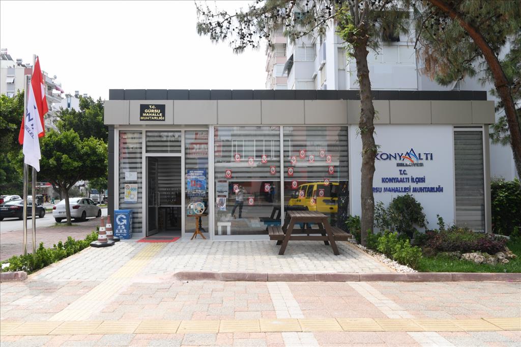 Konyaaltı Belediyesi tarafından yapımı tamamlanan Gürsu Mahallesi muhtarevi hizmete açıldı. Son derece modern yapısıyla dikkat çeken muhtarevi, 13 metrekare muhtar odası, mutfak ve tuvalet ile toplam 50 metrekare büyüklüğe sahip. Konyaaltı Belediye Başkanı Semih Esen, koronavirüs ile mücadele çalışmaları devam ederken diğer projelerin de aksamadan devam ettiğini belirterek bu kapsamda Gürsu Mahallesi muhtarevinin inşasını tamamlayarak hizmete açtıklarını kaydetti.
