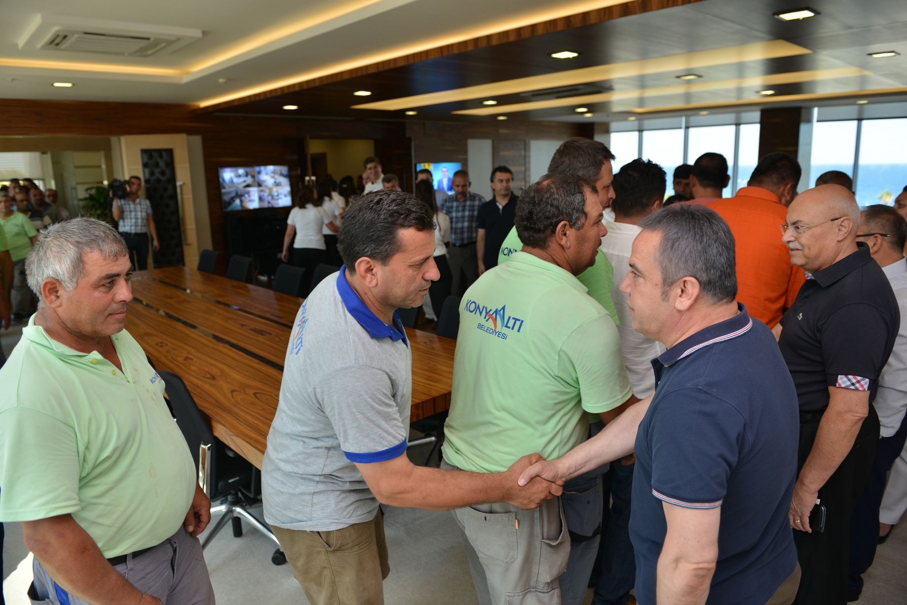 Konyaaltı Belediyesinde bayramlaşma töreni, başkanlık makamında yapıldı. Konyaaltı Belediye Başkanı Muhitin Böcek, belediye başkan yardımcıları ve birim müdürleriyle birlikte tüm çalışanlarının Ramazan Bayramı’nı tek tek kutladı.Birlik ve beraberlik içinde bir bayrama daha ulaşmanın mutluluğunu yaşadıklarını ifade eden Başkan Muhittin Böcek, "Konyaaltı Belediyesi olarak bir geleneği daha koruyoruz ve ilk bayramlaşmayı personelimle yapıyoruz." dedi.Konyaaltı’nda bayramın sorunsuz şekilde kutlanması için Zabıta Müdürlüğü, Temizlik İşleri Müdürlüğü ve Sağlık İşleri Müdürlüğü ekiplerinin bayram boyunca görev alacağını belirten Başkan Muhittin Böcek, "Birlik ve beraberlik içerisinde nice bayramlara kavuşmak dileği ile tüm hemşehrilerimin ve Antalyalıların Ramazan Bayramı’nı kutlarım.