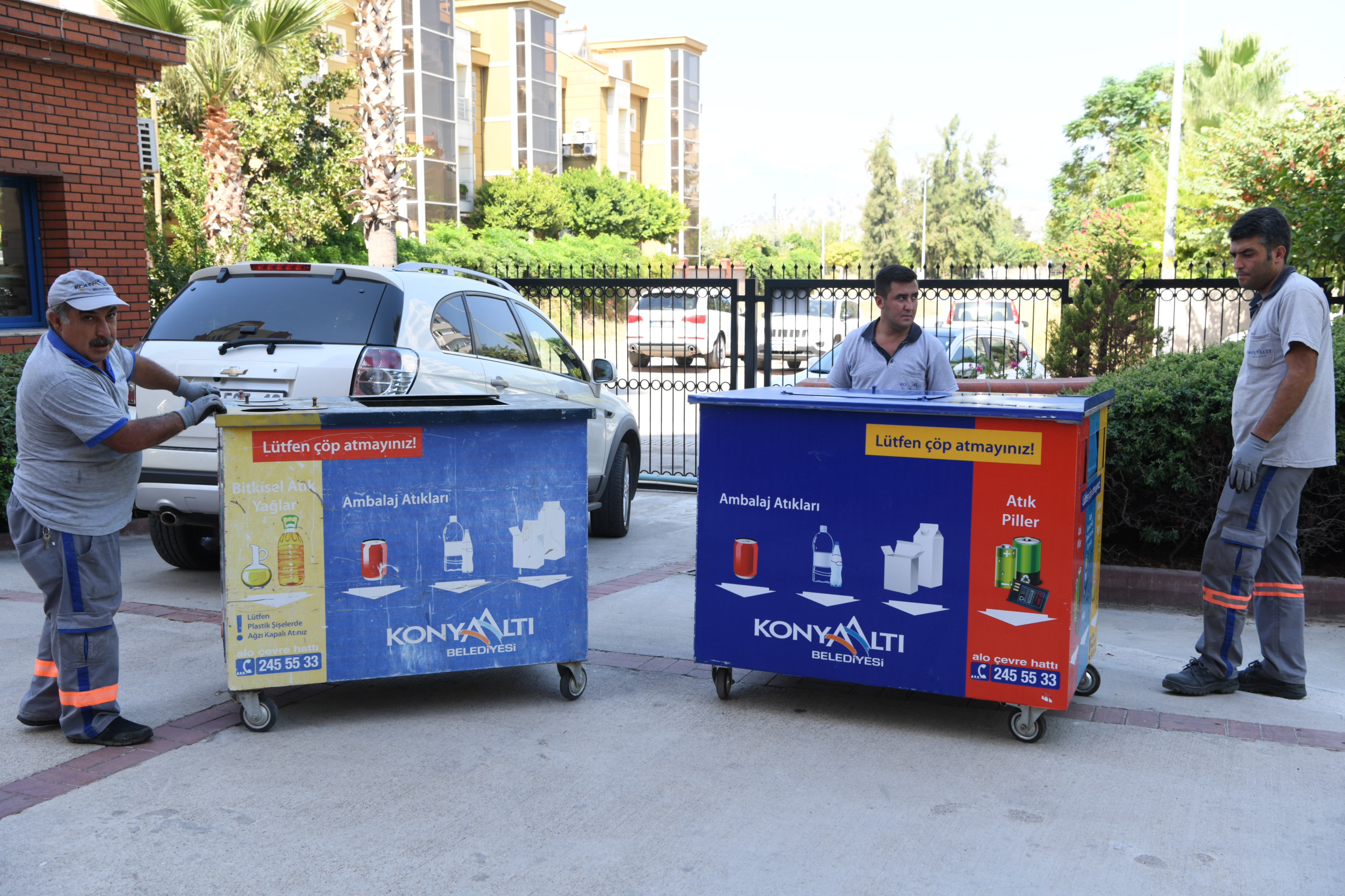 Bünyesinde oluşturduğu Çevre Koruma ve Kontrol Müdürlüğü ile Antalya’da Belediyeler arasında ilke imza atan Konyaaltı Belediyesi, Müdürlüğün konusunda uzman çalışanlarıyla çok daha profesyonel çözümler üretiyor. “Geleceği düşünüyor, geri dönüştürüyoruz’ sloganıyla başlattığı “Atık Yönetimi Projesi”ni sahada uzun bir süredir uygulayan Konyaaltı Belediyesi, proje kapsamında evsel atıkları ayrıştırıyor ve geri dönüşüme kazandırıyor. “Atık Yönetimi”yle Konyaaltı Belediyesi, İlçe sınırları içersinde ambalaj, kızartmalık atık yağ, pil ve elektronik eşya gibi evsel atıkları ayrı ayrı topluyor. Böylece hem insan sağlığını tehdit eden unsurları ber taraf ediyor hem de geri dönüşüme sağladığı materyaller ile ülke ekonomisine katkı sağlıyor. Konyaaltı Belediyesi Çevre Koruma ve Kontrol Müdürlüğü ekipleri, “Atık Yönetimi Projesi” kapsamında geliştirilen çöp konteynırlarını tek tek yeniliyor.