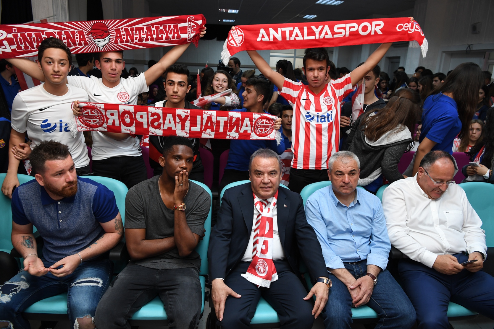 Muhittin Mustafa Böcek Anadolu Lisesi’nde düzenlenen söyleşiye Konyaaltı Belediye Başkanı Muhittin Böcek ile birlikte, Antalyaspor Teknik Direktörü Rıza Çalımbay, yönetici Cumhur Arıcı ve yıldız futbolcu Samuel Eto'o da katıldı. Antalyaspor Teknik Direktörü Rıza Çalımbay ve Samuel Eto'o için hazırlanan sinevizyon gösterisinin ardında, öğrenciler teknik adam ve yıldız futbolcuya sorular yöneltti. Antalyaspor'un ligin ilk 6 haftasındaki performansıyla ilgili soru üzerine Samuel Eto'o, teknik patron Rıza Çalımbay'a övgüler yağdırarak, “Çıkışı olmayan bir tünelde gibiydik. En büyük şansımız büyük tecrübesi olan Rıza hocanın gelmesiydi. Kendisine tekrar teşekkür ediyorum.