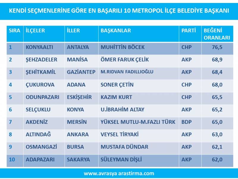 Türkiye genelinde yapılan “En başarılı metropol ilçe belediye başkanı” araştırmanın sonuçlarına göre Konyaaltı Belediye Başkanı Muhittin Böcek, listenin ilk sırasında yer alıyor. AKAM’ın 2-8 Temmuz 2016 tarihleri arasında yapmış olduğu, en başarılı büyükşehir ve ilçe belediye başkanları araştırmasında yüzde 76,5 oy ile Başkan Muhittin Böcek, listede birinci sıraya yerleşti.30 il ve bağlı olduğu ilçelerde 8 bin 890 kişiyle yüz yüze mülakat yöntemiyle yapılan araştırmanın sonuçlarına göre listede yer alan ilk 5 isim şöyle;Konyaaltı Belediye Başkanı Muhittin Böcek yüzde 76,5 oy oranıyla listede birinci sırada yer aldı. Yüzde 68,9 oy oranıyla Manisa Şehzadeler İlçe Belediye Başkanı Ömer Faruk Çelik listenin ikinci sırasında yer alırken, Gaziantep Şehitkamil İlçe Belediye Başkanı Rıdvan Fadıllıoğlu yüzde 68,4 ile üçüncü, Adana Çukurova İlçe Belediye Başkanı Soner Çetin yüzde 68 ile dördüncü, Eskişehir Odunpazarı İlçe Belediye Başkanı Kazım Kurt ise yüzde 65,5 ile listede beşinci sırada yer aldı.Anket sonuçlarını değerlendiren Başkan Muhittin Böcek, “Modern kentler inşa etmek çoğu zaman kolay değildir.