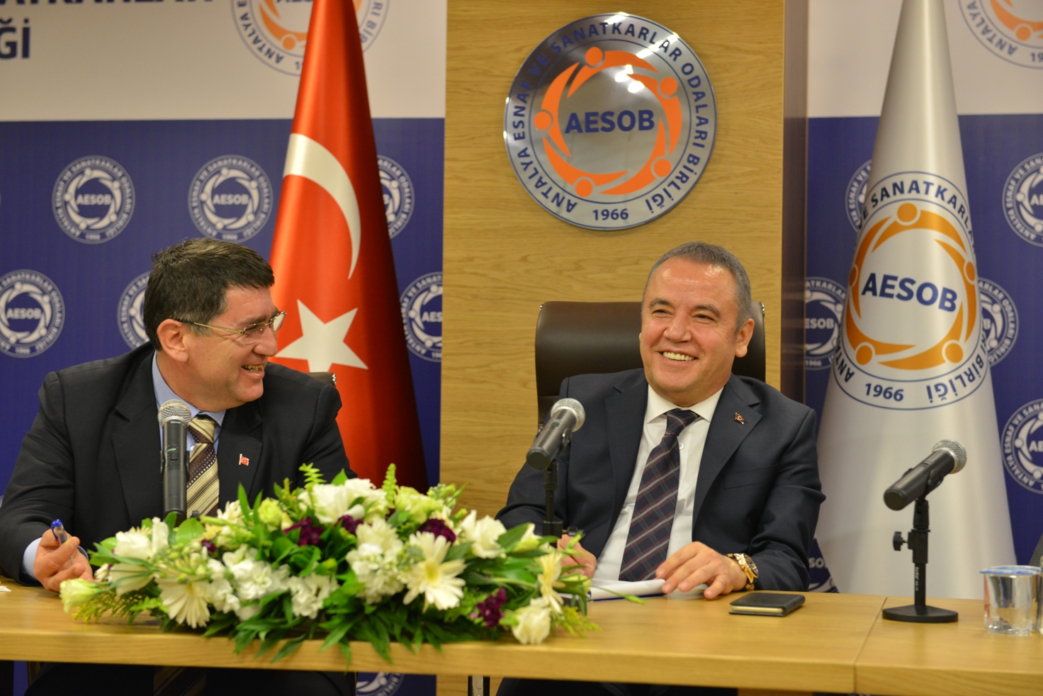 Konyaaltı Belediye Başkanı Muhittin Böcek, AESOB’un düzenlediği “Oda ve Belediye Başkanları Toplantısı”nın konuğu oldu. AESOB Başkanı Adlıhan Dere’nin başkanlığında gerçekleştirilen toplantıda Başkan Muhittin Böcek, Konyaaltı’na modern kimlik kazandıran projelerini anlattı.Sosyal belediyecilik uygulamalarını en iyi yapan belediyeler arasında yer aldıklarını söyleyen Başkan Böcek, Gıda ve Giyim Bankası, Engelli Merkezi, Beslenme ve Diyet Bölümü, Aile Danışma Merkezi, Evde Bakım Servisi gibi bir çok sosyal destek birimini Konyaaltı Sosyal Hizmetler Merkezi (KOSHİM)’yle tek çatı altında topladıklarını söyledi. Başkan Böcek, tüm bu sosyal hizmetlerden 2016 yılı içinde 13 bine yakın kişinin faydalandığını bildirdi. Başkan Böcek, “Bölgemizde bütün vatandaşlarımızı ilgilendirecek önemli hizmetler üretiyoruz.
