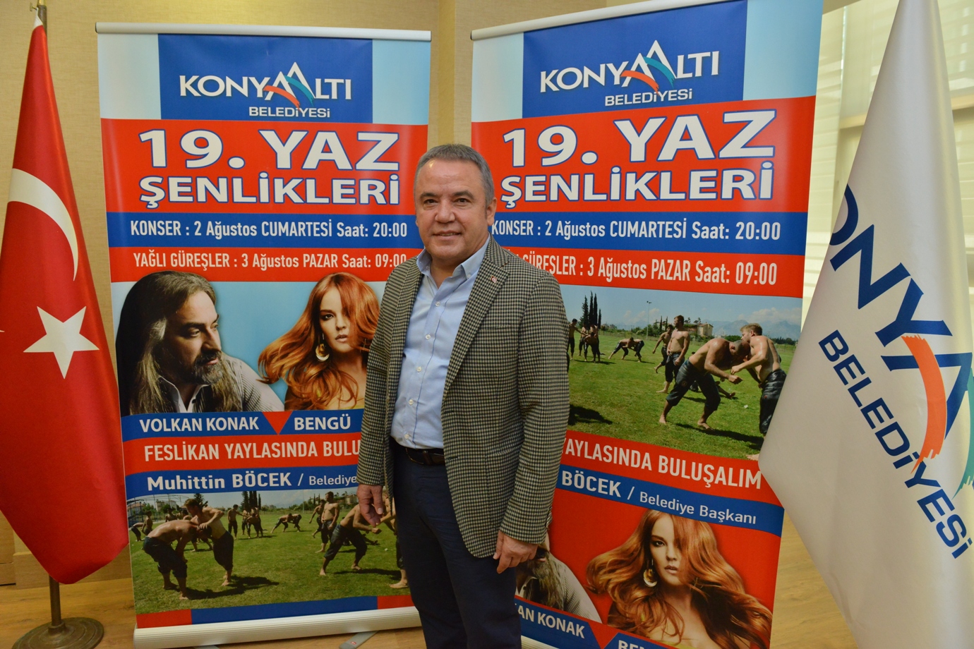 Kılıçdaroğlu, Konyaaltı Yaz Şenlikleri’ne geliyorKonyaaltı Belediye Başkanı Muhittin Böcek, Feslikan Yaylası’nda her yıl geleneksel olarak düzenlenen Yaz Şenlikleri’nin 19’uncusu için start verdi. Konyaaltı Belediyesi Feslikan Yaylası Yaz Şenlikleri’nin 19’uncusu bu yıl 02-03 Ağustos günleri arasında gerçekleştirilecek. Konuyla ilgili basın toplantısı düzenleyen Konyaaltı Belediye Başkanı Muhittin Böcek, Ramazan Bayramı’nın hemen ardından düzenledikleri Feslikan Yaylası Yaz Şenlikleri’yle Antalyalılara, eğlenip dinlenebilecekleri bir eğlence programı sunmak istediklerini söyledi. Bengü ve Volkan Konak sahne alacak“2 Ağustos Cumartesi günü saat 20.00’de sevilen pop müziği sanatçısı Bengü konseriyle başlayacak olan etkinlik, aynı gece sahne alacak olan Kuzeyin oğlu Volkan Konak konserleriyle devam edecek.