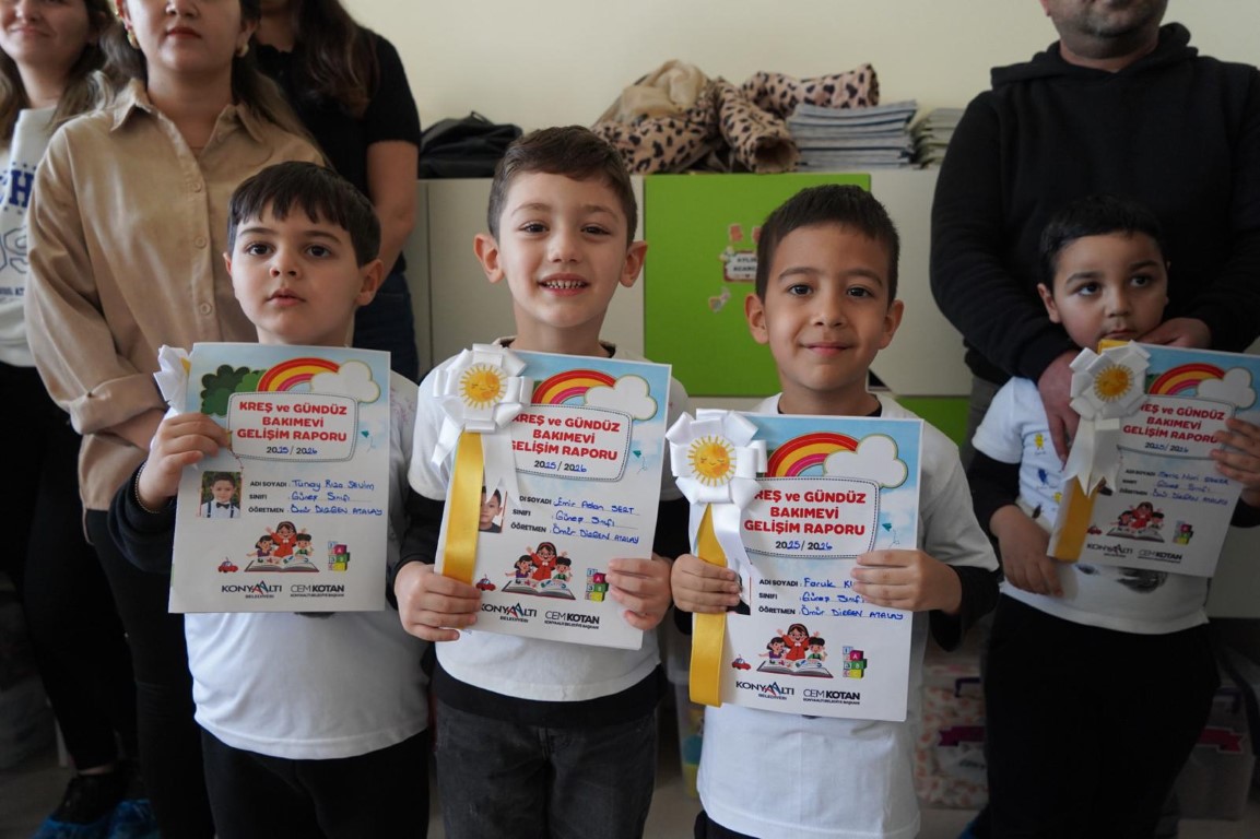 Konyaaltı Belediyesi bünyesinde hizmet veren Toros, Gürsu, Uncalı, Hurma ve Doğa Çocuk Enstitüsü Kreş ve Gündüz Bakımevleri’nde eğitim alan minikler, eğitim öğretim yılının ilk döneminin sona ermesiyle karne heyecanı yaşadı. Etkinlikte çocuklar karne alırken, aileler ise bu özel ana tanıklık etti. Veliler çocuklarının sosyal ve eğitsel gelişimine katkı sunan Konyaaltı Belediyesi’ne teşekkürlerini iletti. Minikler karne töreni boyunca müzik, dans ve oyunlarla keyifli anlar yaşadı. ÇOCUKLARIN GÖZLERİNDEKİ UMUT IŞIĞI BİZE GÜÇ VERİYORKreşlerdeki eğitim seviyesini her zaman üst seviyede tuttuklarını vurgulayan Konyaaltı Belediye Başkanı Cem Kotan, “Konyaaltı Belediyesi olarak çocuklarımızın eğitim hayatlarının en başından itibaren nitelikli, güvenli ve sevgi dolu bir ortamda gelişim göstermelerini çok önemsiyoruz.