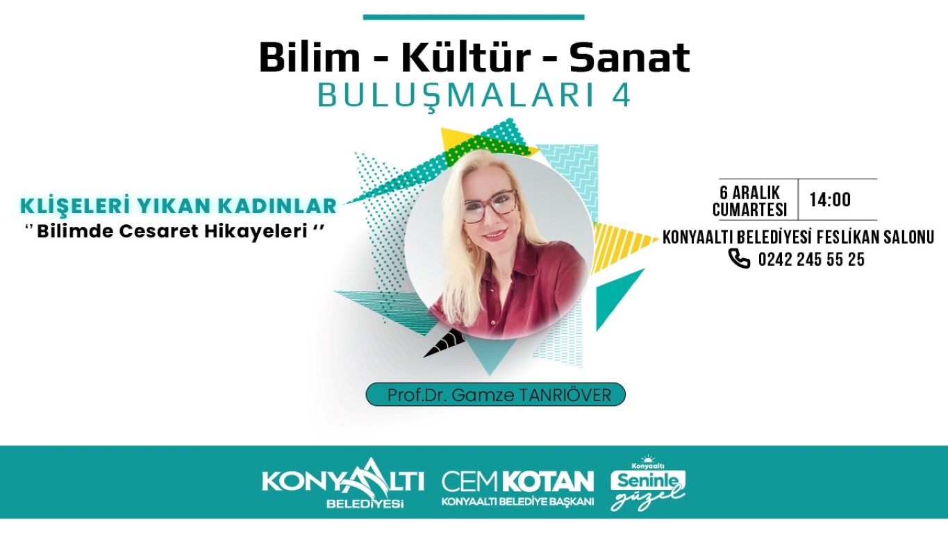 Konyaaltı Belediyesi, Bilim-Kültür-Sanat Buluşmaları’nın dördüncüsünü düzenleyeceğini duyurdu. Konyaaltı Belediyesi Kültür, Sanat ve Sosyal İşler Müdürlüğü’nden edinilen bilgiye göre buluşmanın, ‘Klişeleri Yıkan Kadınlar’ konusu altında ‘Bilimde Cesaret Hikayeleri’ adıyla düzenleneceği kaydedildi. Prof. Dr. Gamze Tanrıöver'in sunumuyla gerçekleşecek 4’üncü Bilim-Kültür-Sanat Buluşması, 6 Aralık Cumartesi günü saat 14:00’te Konyaaltı Belediyesi Ana Hizmet Binası içerisinde yer alan Feslikan Salonu’nda düzenlenecek.