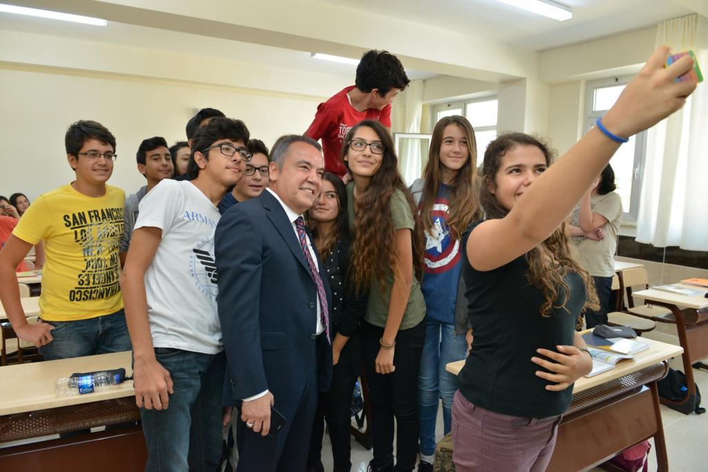 “Bir ülkenin en değerli varlıkları geleceğimizi emanet edeceğimiz gençlerimizdir.” diyen Başkan Böcek, öğrencileri sınıflarında ziyaret etti. Başkan Muhittin Böcek, Ülkemizin kalkınmasında , toplumun gelişmesinde, dinamizmin etkileşiminde önemli rol oynayan siz değerli öğrenciler, okulunuza hoş geldiniz. 2015-2016 eğitim-öğretim yılında sizlere başarılar diliyorum.” diye konuştu. Tüm ihtiyaç ve önerilere bizzat cevap vereceğini ifade eden Muhittin Böcek, öğrencilerle birlikte öz-çekim yaparak bu anı ölümsüzleştirdi.