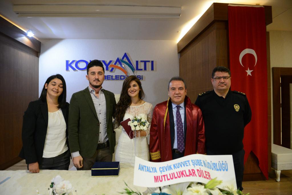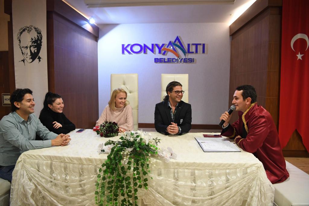 Binlerce yerli ve yabancının ikamet ettiği Konyaaltı’nda yılın son nikahı ise yabancı uyruklu bir geline kıyıldı. Sinan Gür ve Elena Artemenko çifti 2017 yılında son nikah işlemi yapılan çift oldu. Konyaaltı Belediye Başkanı Muhittin Böcek’ten aldığı yetki ile evlilik işlemini yapan nikah memuru Mehmet Çelikel, yılın son nikahı münasebetiyle çifte kahve fincanı takımı hediye etti.
