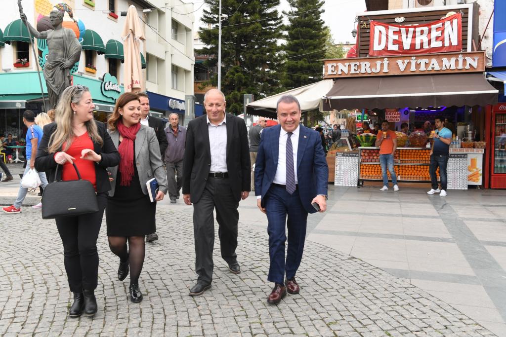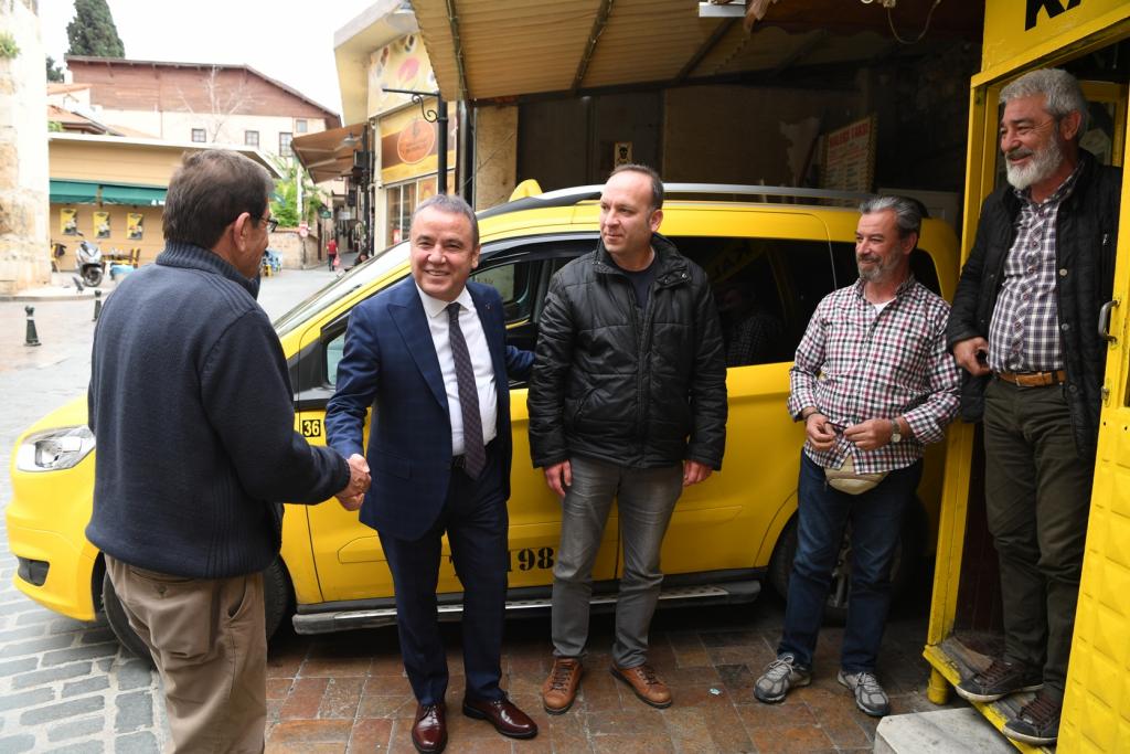 Kazım Özalp Caddesi’nde esnaf ve vatandaşlar tarafından büyük ilgiyle karşılanan Başkan Muhittin Böcek, Kale Kapısı’nda 48 yıldır ayakkabı boyacılığı yapan Oktay Topuz’u ziyaret etti. Ayakkabılarını boyatan Başkan Böcek, Topuz ile uzun süre sohbet etti. Ardından Kaleiçi Yat Limanı’na doğru yürüyen Başkan Böcek, Kaleiçi Taksi Durağı esnafını da ziyaret etti.