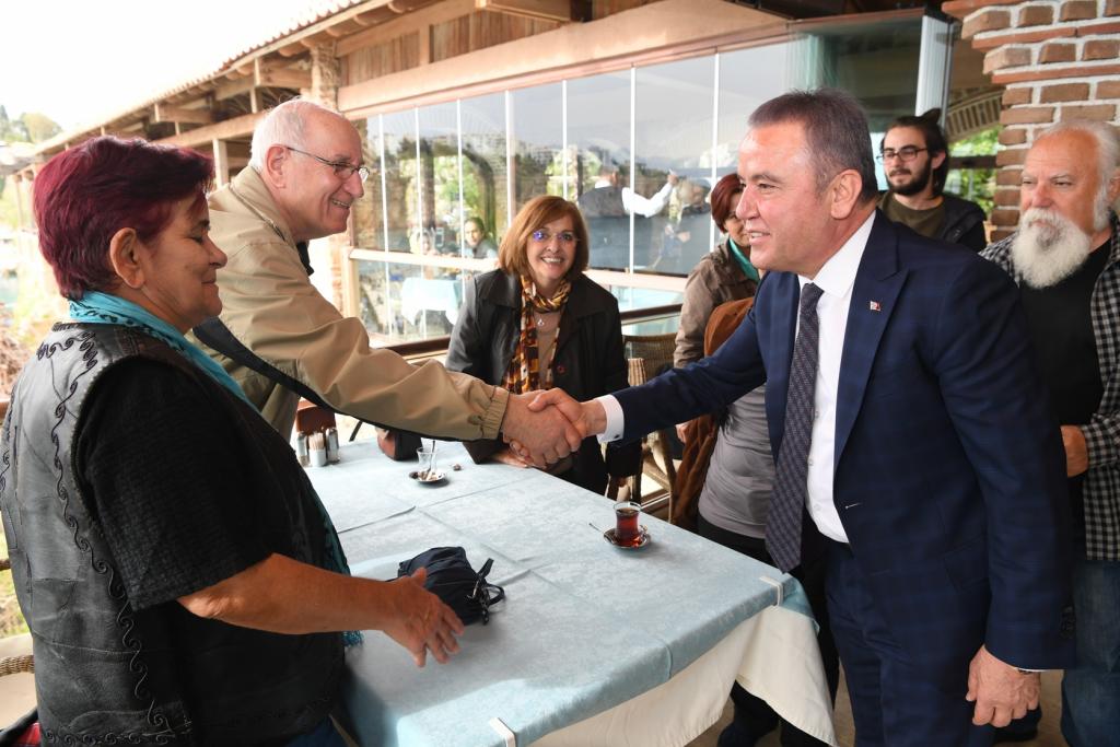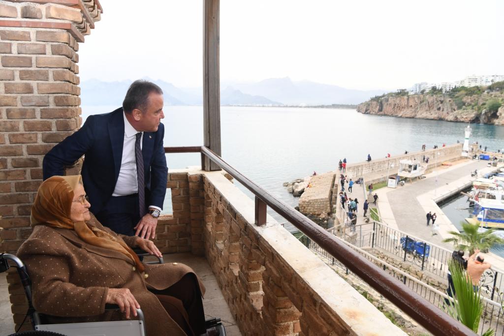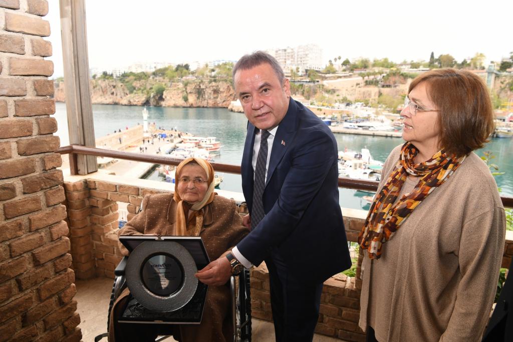 Kaleiçi’nde esnafları tarafından ilgiyle karşılanan Muhittin Böcek, Mermerli Restoranda Türkiye’nin ilk kadın fenercisi olarak tarihe geçen Fatma Doman ile bir araya geldi. Türk kadınların tarihin her dönemine bir not düştüğünü ifade eden Başkan Böcek, 1950’li yıllarda verdiği mücadeleyle günümüzde bir çok kadına örnek olan Fatma Doman’a plaket takdim etti. Fatma Doman ise konuşmasında Başkan Muhittin Böcek’te plaket almanın kendisi için büyük onur olduğunu söyledi.