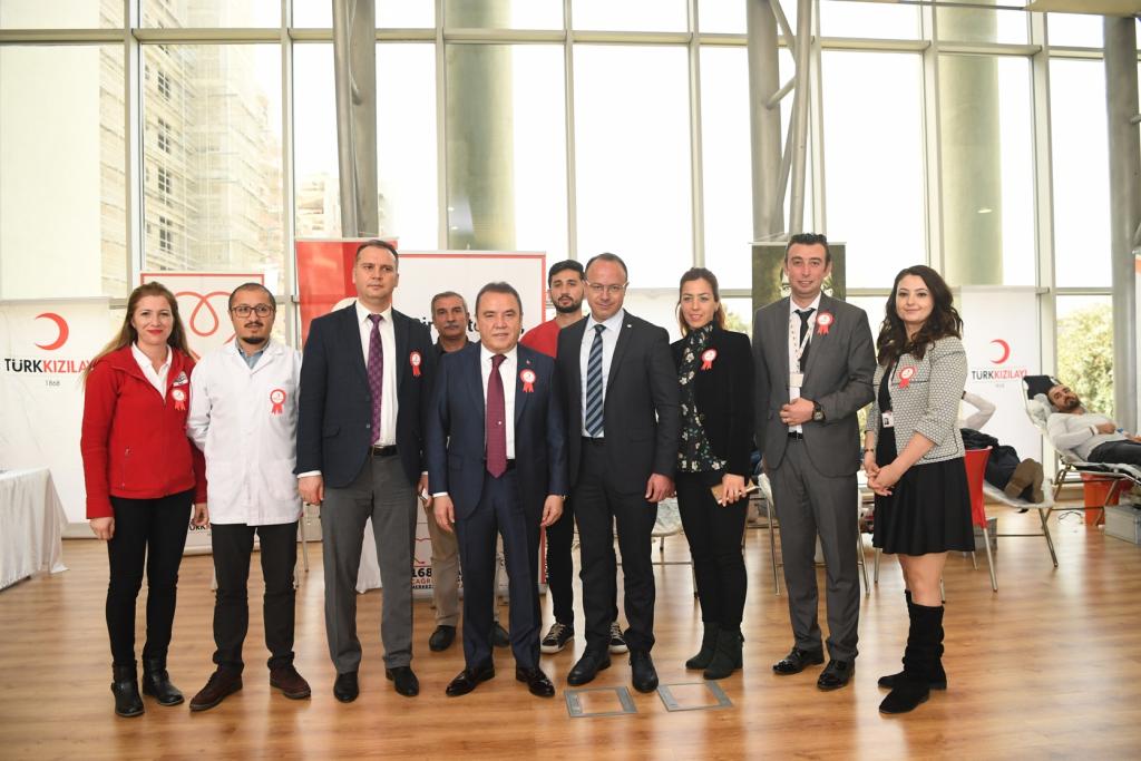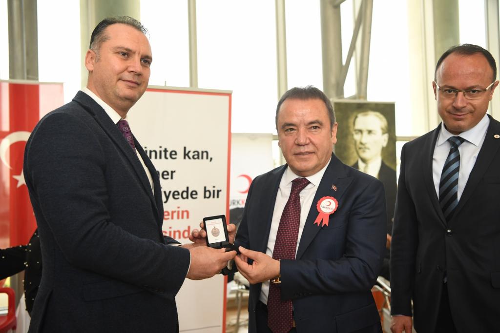 Türk Kızılay’ı Batı Akdeniz Bölge Müdürü Dr. Tufan Ertop, Konyaaltı Belediyesi ile her yıl güzel bir işbirliği sağladıklarını söyleyerek, kampanya destek veren Başkan Böcek’e teşekkür etti. Dr. Tufan Ertop, 12. kez kan bağışında bulunan Başkan Muhittin Böcek’e bronz madalya ve çiçek takdim etti. Başkan Böcek, daha sonra, Türk Kızılay’ı Batı Akdeniz Bölge Müdürü Dr. Tufan Ertop, Antalya Kan Merkezi Müdürü Dr. Erkan Kaya ve çalışanlarla günün anısına hatıra fotoğrafı çektirdi. Gün boyu birçok vatandaş Konyaaltı Belediyesi’ne gelerek, kan bağışında bulundu.