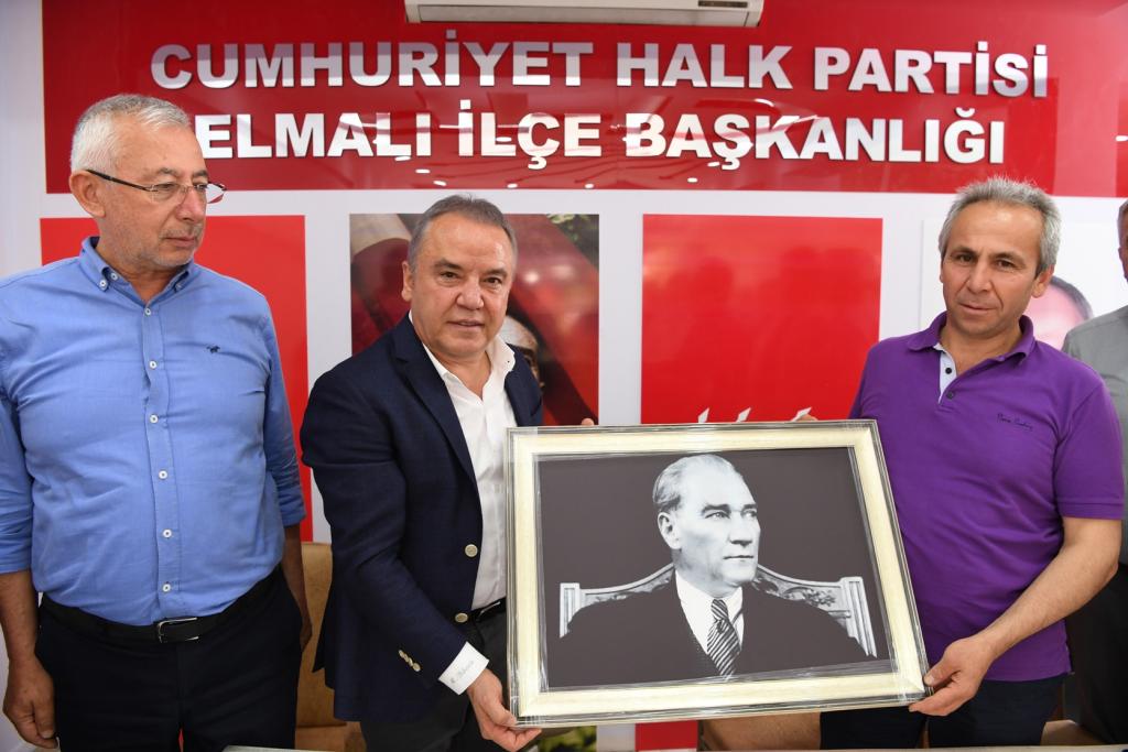 Başkan Böcek, beraberindeki heyetle birlikte Korkuteli ziyareti sonrası Elmalı’da CHP İlçe Teşkilatıyla bir araya geldi. İlçe Başkanı Şakir Aydın ve yönetimi tarafından büyük sevgiyle karşılanan Başkan Böcek, Gazipaşa’dan Kaş’a Antalya’yı mahalle mahalle gezdiğini belirterek ayrım yapmadan herkesle kucaklaştıklarını söyledi. Partililerden büyük alkış alan Başkan Muhittin Böcek, daha sonra CHP Elmalı İlçe Başkanı Şakir Aydın’a Atatürk’ün çerçeveli portre resmini hediye etti.
